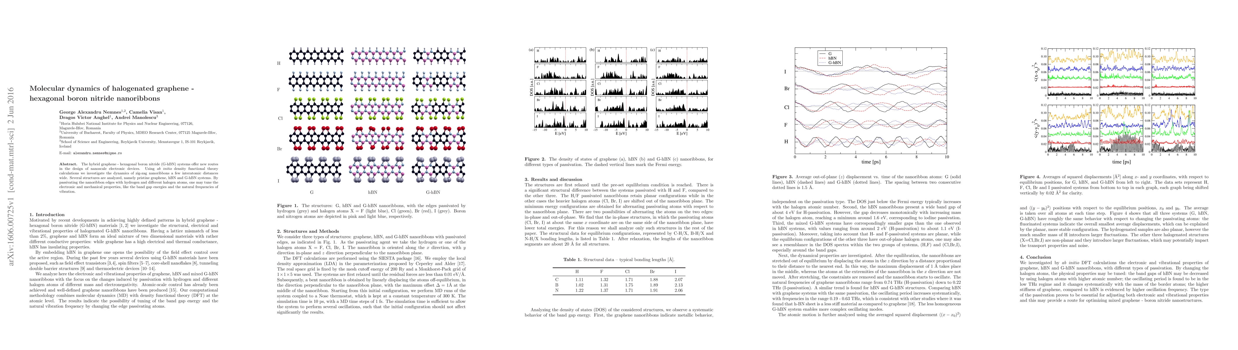 This study utilizes {\it ab initio} density functional theory to examine the molecular dynamics of hybrid graphene-hexagonal boron nitride nanoribbons, exploring how passivating edges with hydrogen and various halogen atoms influences their electronic and mechanical properties, including band gap energies and vibrational frequencies.