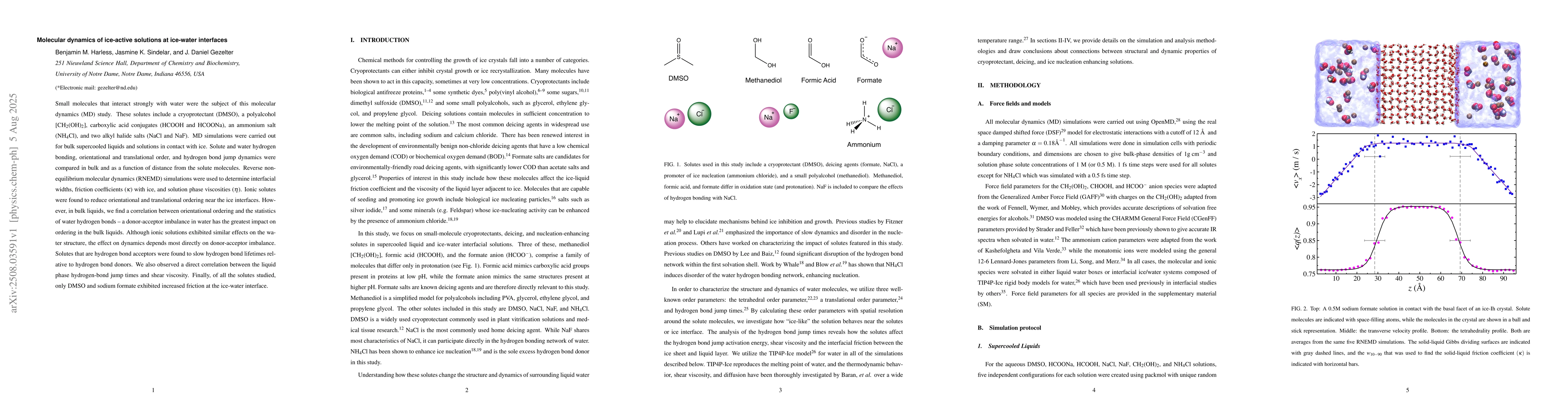 Small molecules that interact strongly with water were the subject of this molecular dynamics (MD) study. These solutes include a cryoprotectant (DMSO), a polyalcohol [CH$_2$(OH)$_2$], carboxylic acid conjugates (HCOOH and HCOONa), an ammonium salt (NH$_4$Cl), and two alkyl halide salts (NaCl and NaF). MD simulations were carried out for bulk supercooled liquids and solutions in contact with ice. Solute and water hydrogen bonding, orientational and translational order, and hydrogen bond jump dynamics were compared in bulk and as a function of distance from the solute molecules. Reverse non-equilibrium molecular dynamics (RNEMD) simulations were used to determine interfacial widths, friction coefficients ($\kappa$) with ice, and solution phase viscosities ($\eta$). Ionic solutes were found to reduce orientational and translational ordering near the ice interfaces. However, in bulk liquids, we find a correlation between orientational ordering and the statistics of water hydrogen bonds -- a donor-acceptor imbalance in water has the greatest impact on ordering in the bulk liquids. Although ionic solutions exhibited similar effects on the water structure, the effect on dynamics depends most directly on donor-acceptor imbalance. Solutes that are hydrogen bond acceptors were found to slow hydrogen bond lifetimes relative to hydrogen bond donors. We also observed a direct correlation between the liquid phase hydrogen-bond jump times and shear viscosity. Finally, of all the solutes studied, only DMSO and sodium formate exhibited increased friction at the ice-water interface.