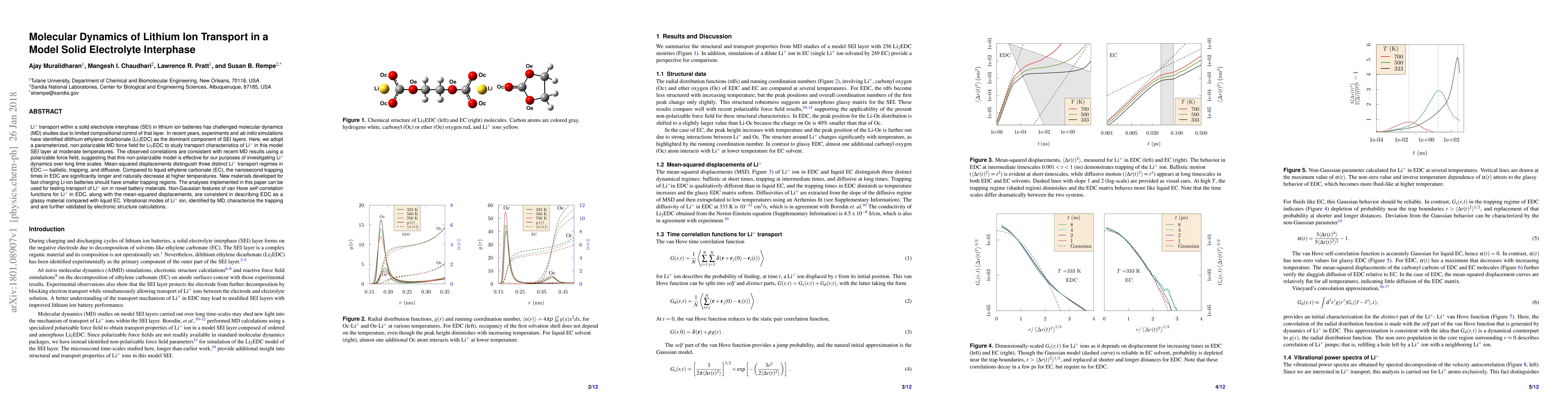 This paper investigates Li+ transport dynamics in a dilithium ethylene dicarbonate (Li2EDC) model solid electrolyte interphase using a non-polarizable molecular dynamics force field. The study identifies three Li+ transport regimes and finds that trapping times in Li2EDC are longer than in liquid ethylene carbonate, suggesting that new battery materials should minimize trapping regions for faster charging.