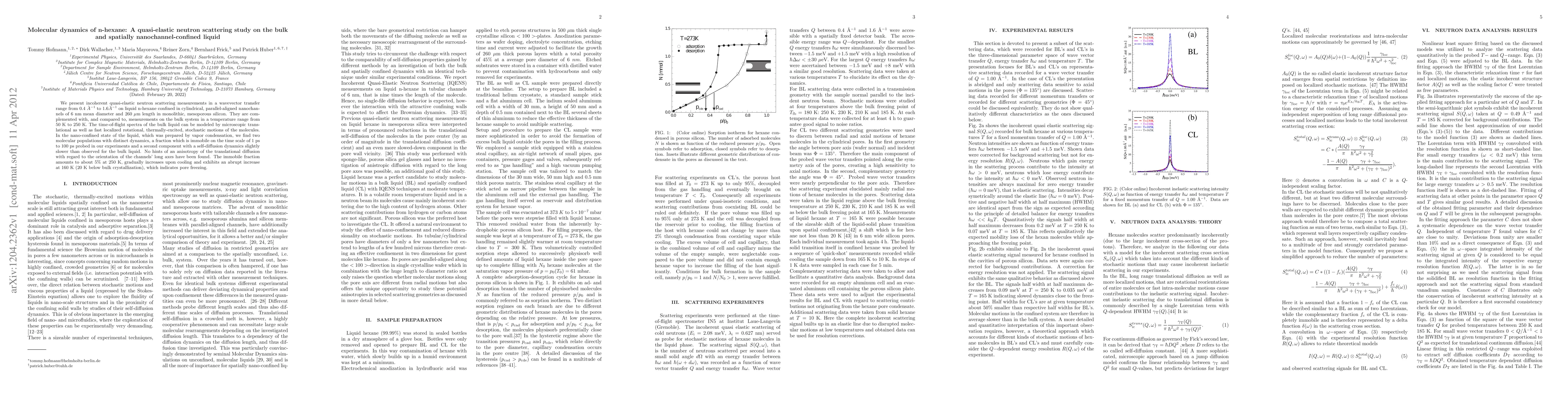 We present incoherent quasi-elastic neutron scattering measurements in a wavevector transfer range from 0.4 AA^{-1} to 1.6AA^{-1} on liquid n-hexane confined in cylindrical, parallel-aligned nanochannels of 6 nm mean diameter and 260 micrometer length in monolithic, mesoporous silicon. They are complemented with, and compared to, measurements on the bulk system in a temperature range from 50K to 250K. The time-of-flight spectra of the bulk liquid can be modeled by microscopic translational as well as fast localized rotational, thermally-excited, stochastic motions of the molecules. In the nano-confined state of the liquid, which was prepared by vapor condensation, we find two molecular populations with distinct dynamics, a fraction which is immobile on the time scale of 1ps to 100ps probed in our experiments and a second component with a self-diffusion dynamics slightly slower than observed for the bulk liquid. No hints of an anisotropy of the translational diffusion with regard to the orientation of the channels' long axes have been found. The immobile fraction amounts to about 5% at 250K, gradually increases upon cooling and exhibits an abrupt increase at 160K (20K below bulk crystallization), which indicates pore freezing