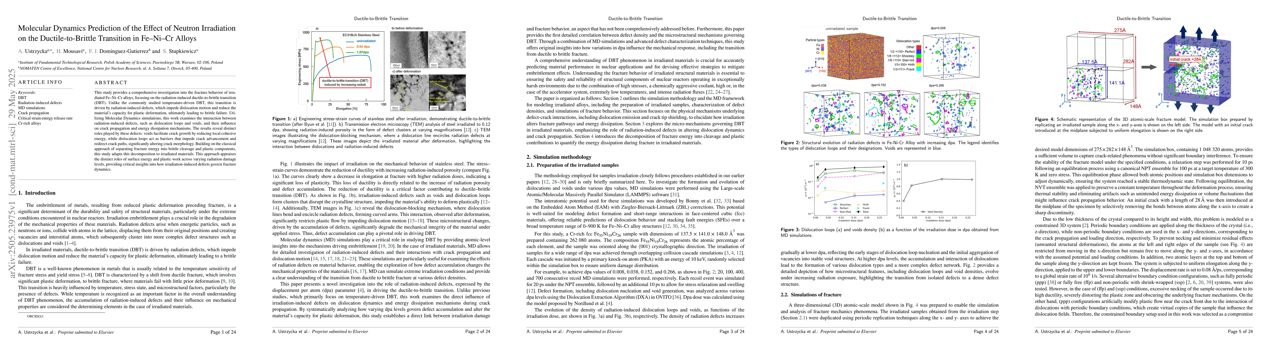 Molecular Dynamics simulations were employed to investigate the interaction between radiation-induced defects and their influence on crack propagation and energy dissipation mechanisms in irradiated Fe-Ni-Cr alloys.