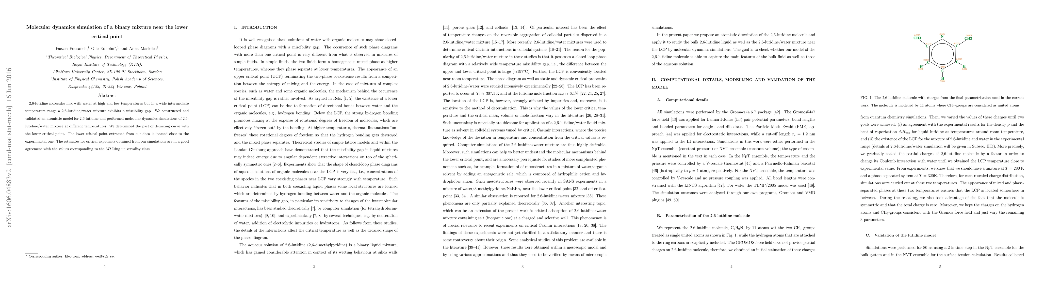 2,6-lutidine molecules mix with water at high and low temperatures but in a wide intermediate temperature range a 2,6-lutidine/water mixture exhibits a miscibility gap. We constructed and validated an atomistic model for 2,6-lutidine and performed molecular dynamics simulations of 2,6-lutidine/water mixture at different temperatures. We determined the part of demixing curve with the lower critical point. The lower critical point extracted from our data is located close to the experimental one. The estimates for critical exponents obtained from our simulations are in a good agreement with the values corresponding to the $3D$ Ising universality class.