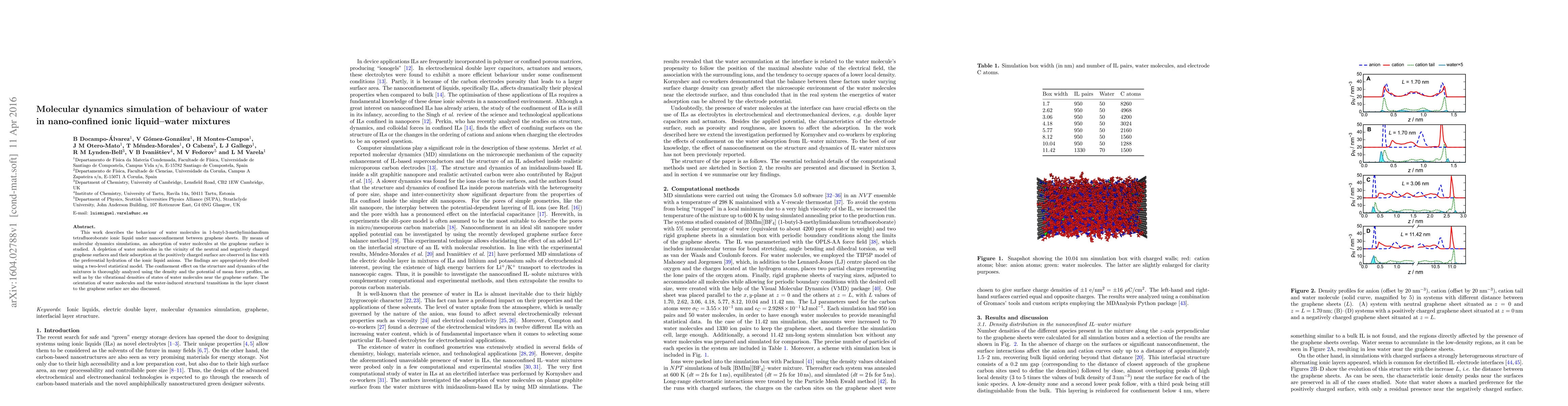 This paper uses molecular dynamics simulations to study the behavior of water molecules in a nano-confined ionic liquid-water mixture between graphene sheets, revealing adsorption at positively charged surfaces and structural changes influenced by confinement. The findings are analyzed through density, potential of mean force profiles, and vibrational densities of states.
