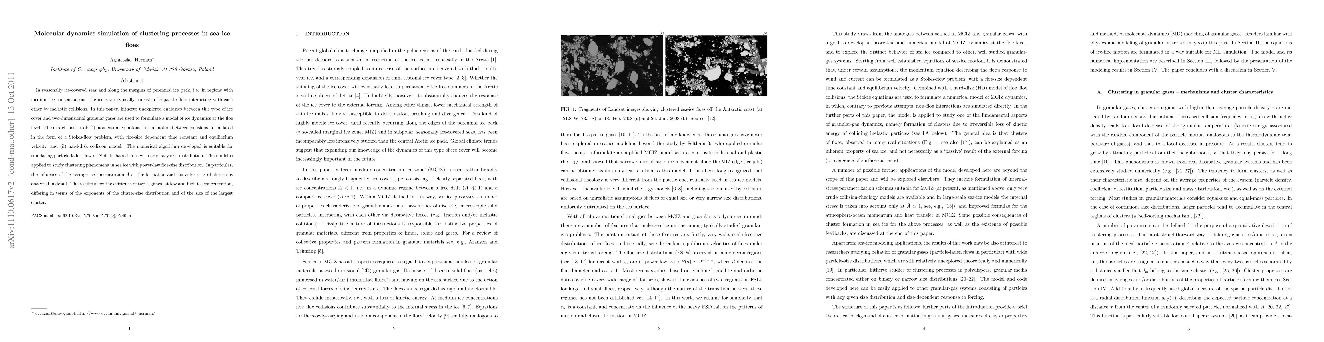 This paper develops a molecular-dynamics simulation model to study clustering processes in sea-ice floes, drawing analogies to two-dimensional granular gases. The model includes Stokes-flow momentum equations and a hard-disk collision model, revealing two regimes of clustering behavior based on average ice concentration.