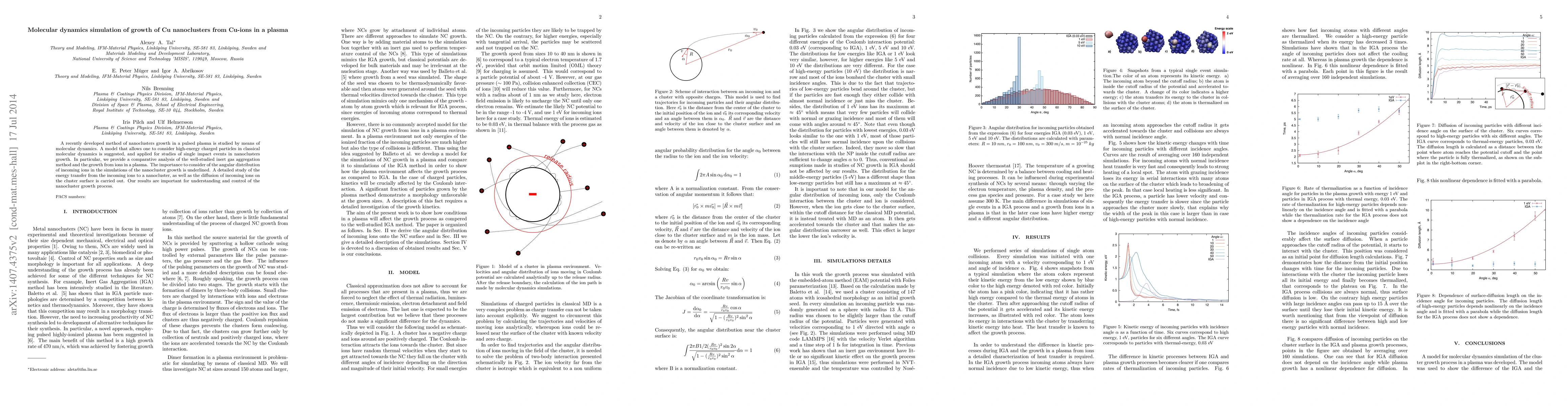 This paper uses molecular dynamics simulations to study the growth of Cu nanoclusters from Cu-ions in a plasma, comparing it to the inert gas aggregation method. It highlights the importance of considering the angular distribution of ions and provides insights into energy transfer and ion diffusion on the cluster surface, crucial for controlling nanocluster growth.