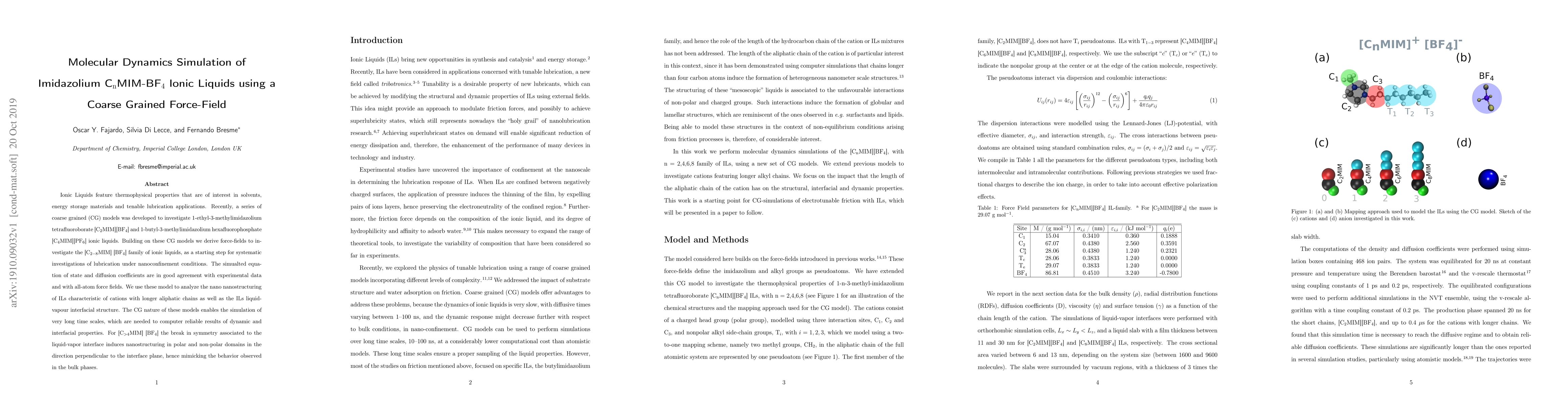 This paper presents molecular dynamics simulations of imidazolium CnMIM-BF4 ionic liquids using a coarse-grained force-field, showing good agreement with experimental data and all-atom models. The study reveals the nanostructuring of ILs with longer aliphatic chains and the liquid-vapor interfacial structure, highlighting the potential of these models for long-time simulations of dynamic and interfacial properties.