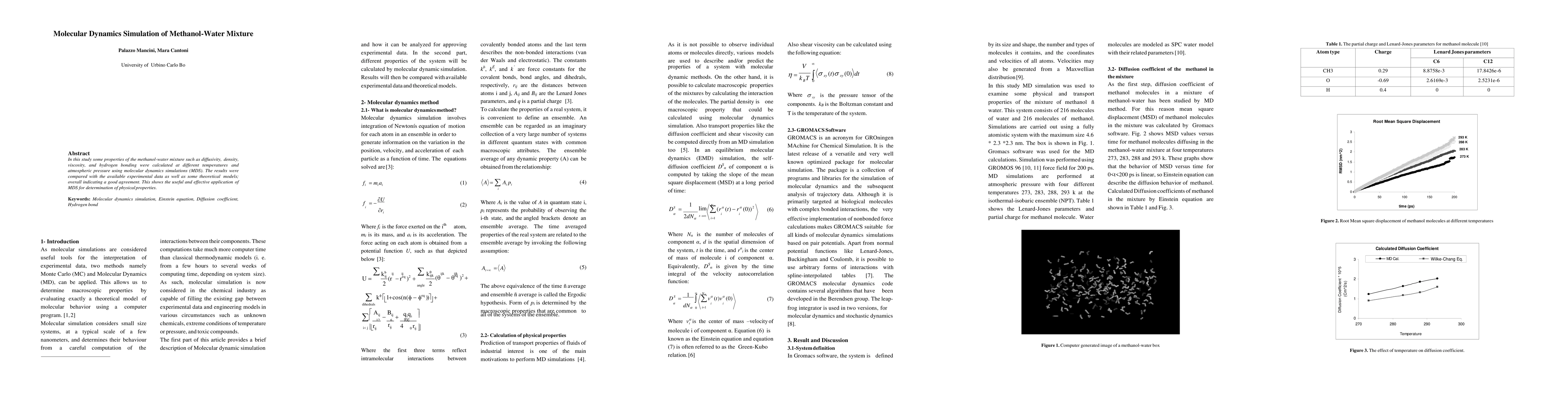 This study uses molecular dynamics simulations to calculate the diffusivity, density, viscosity, and hydrogen bonding in methanol-water mixtures at various temperatures, showing good agreement with experimental data and theoretical models, thus demonstrating MDS's effectiveness for determining physical properties.