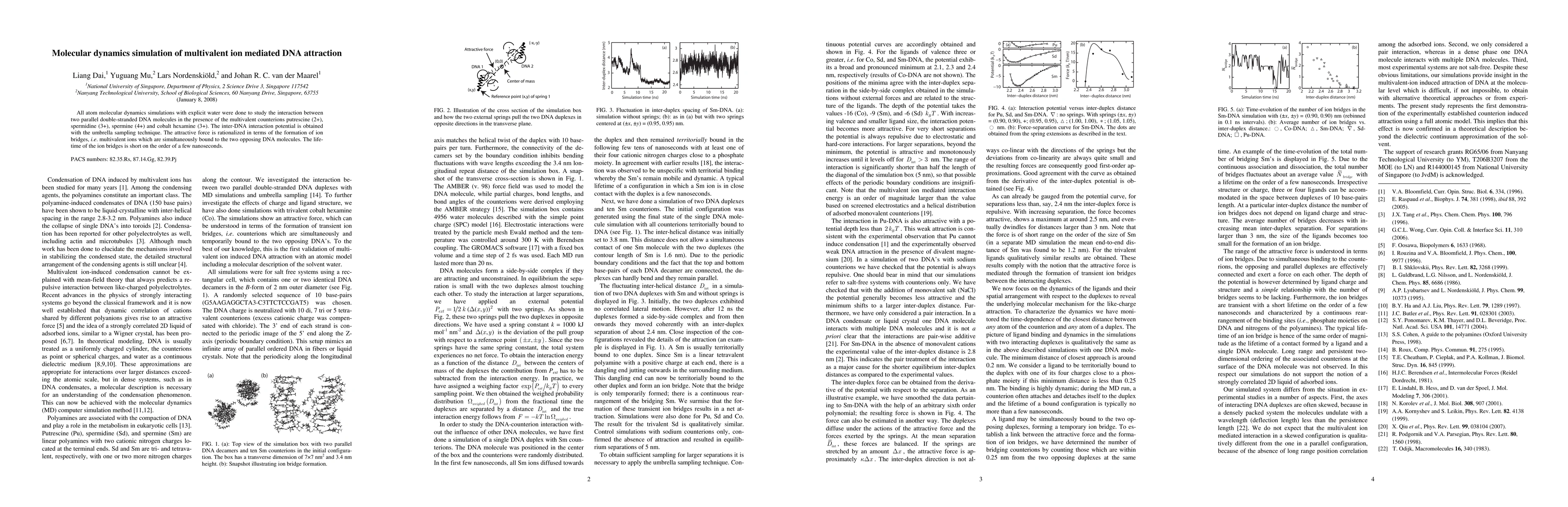 This study uses molecular dynamics simulations to investigate the attraction between two parallel DNA molecules mediated by multivalent ions like putrescine, spermidine, spermine, and cobalt hexamine. The attractive force is attributed to the transient formation of ion bridges, with these bridges lasting only a few nanoseconds.