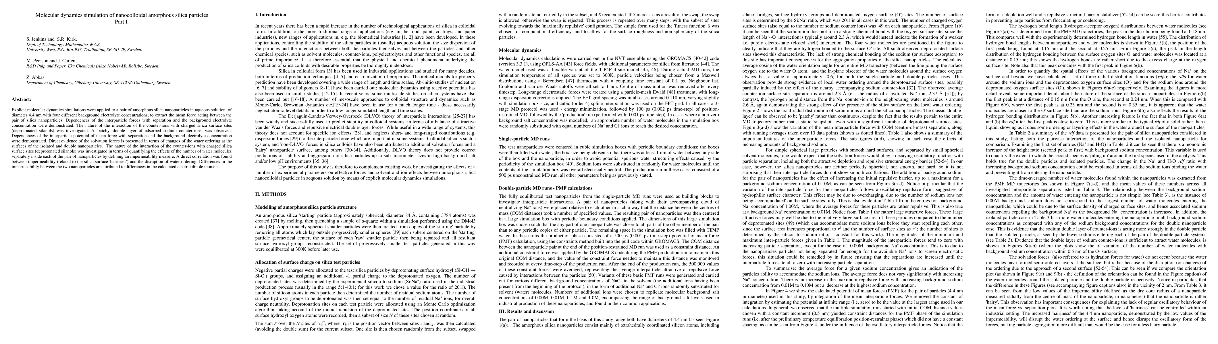 Explicit molecular dynamics simulations were applied to a pair of amorphous silica nanoparticles in aqueous solution, of diameter 4.4 nm with four different background electrolyte concentrations, to extract the mean force acting between the pair of silica nanoparticles. Dependences of the interparticle forces with separation and the background electrolyte concentration were demonstrated. The nature of the interaction of the counter-ions with charged silica surface sites (deprotonated silanols) was investigated. A 'patchy' double layer of adsorbed sodium counter-ions. was observed. Dependences of the interparticle potential of mean force with separation and the background electrolyte concentration were demonstrated. Direct evidence of the solvation forces is presented in terms of changes of the water ordering at the surfaces of the isolated and double nanoparticles. The nature of the interaction of the counter-ions with charged silica surface sites (deprotonated silanols) was investigated in terms of quantifying the effects of the number of water molecules separately inside each of the pair of nanoparticles by defining an impermeability measure. A direct correlation was found between impermeability (related to the silica surface 'hairiness') and the disruption of water ordering. Differences in the impermeability between the two nanoparticles are attributed to differences in the calculated electric dipole moment.