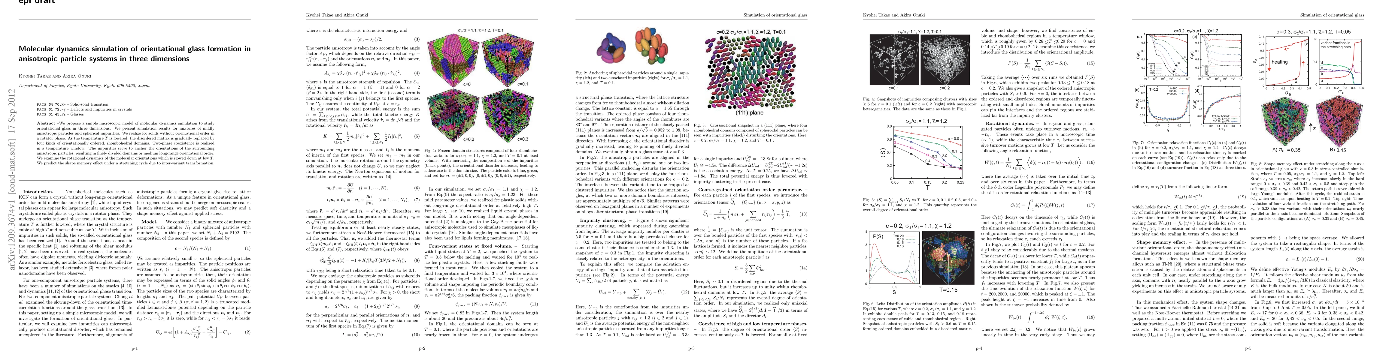 This paper presents molecular dynamics simulations of orientational glass formation in anisotropic particle systems, revealing the emergence of rhombohedral domains and shape memory effects as temperature decreases. The presence of spherical impurities anchors particle orientations, leading to finely divided domains and medium long-range order.