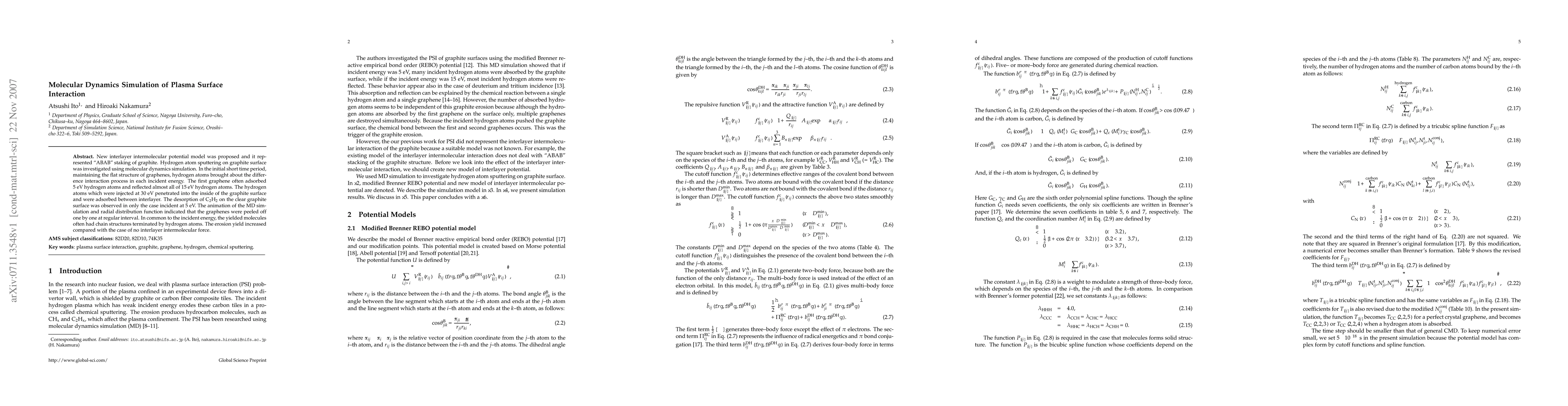 This paper proposes a new interlayer intermolecular potential model for "ABAB" staking of graphite and uses molecular dynamics simulation to study hydrogen atom sputtering. The results show that hydrogen atoms at different energies interact differently with the graphite surface, with 5 eV hydrogen atoms being adsorbed and 15 eV hydrogen atoms reflected, while 30 eV hydrogen atoms penetrate and adsorb between layers, leading to the peeling of graphene layers and the formation of chain structures terminated by hydrogen atoms.