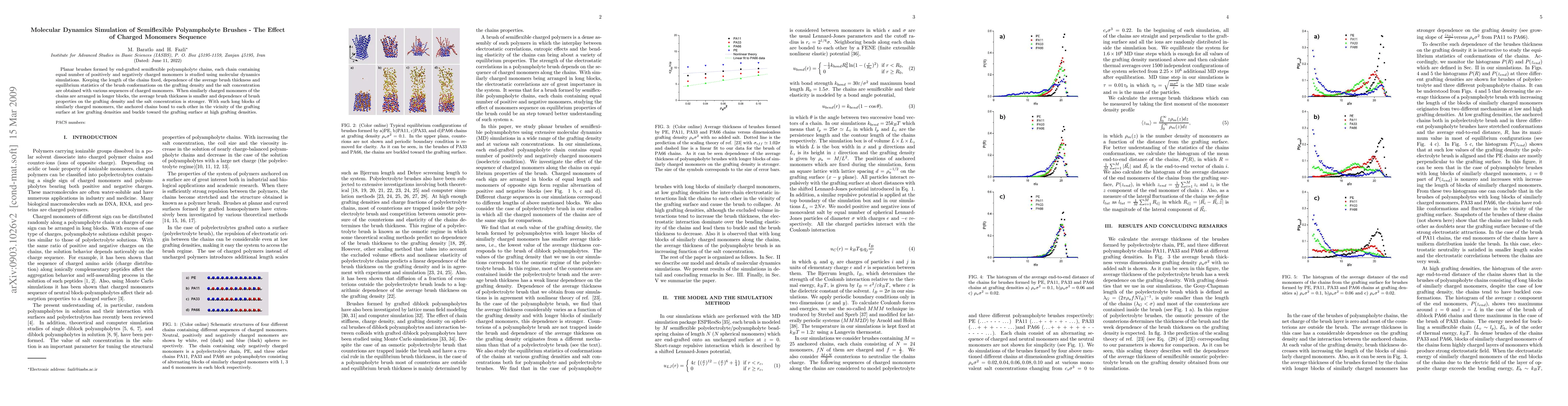 Planar brushes formed by end-grafted semiflexible polyampholyte chains, each chain containing equal number of positively and negatively charged monomers is studied using molecular dynamics simulations. Keeping the length of the chains fixed, dependence of the average brush thickness and equilibrium statistics of the brush conformations on the grafting density and the salt concentration are obtained with various sequences of charged monomers. When similarly charged monomers of the chains are arranged in longer blocks, the average brush thickness is smaller and dependence of brush properties on the grafting density and the salt concentration is stronger. With such long blocks of similarly charged monomers, the anchored chains bond to each other in the vicinity of the grafting surface at low grafting densities and buckle toward the grafting surface at high grafting densities.
