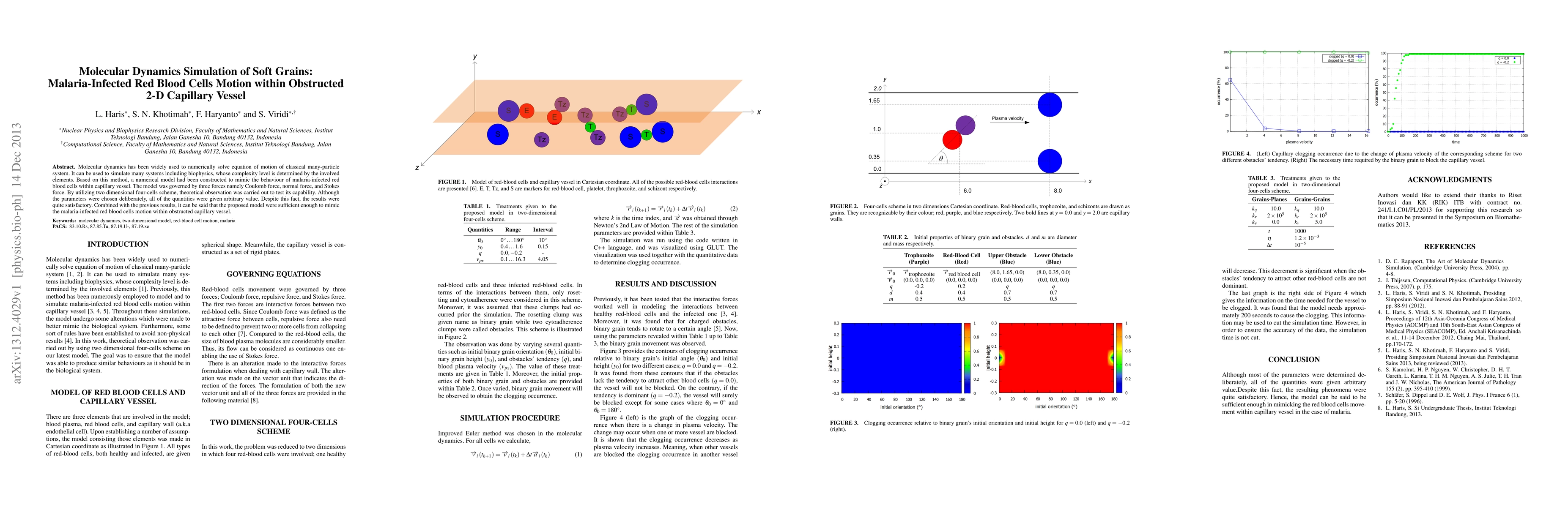Molecular dynamics has been widely used to numerically solve equation of motion of classical many-particle system. It can be used to simulate many systems including biophysics, whose complexity level is determined by the involved elements. Based on this method, a numerical model had been constructed to mimic the behaviour of malaria-infected red blood cells within capillary vessel. The model was governed by three forces namely Coulomb force, normal force, and Stokes force. By utilizing two dimensional four-cells scheme, theoretical observation was carried out to test its capability. Although the parameters were chosen deliberately, all of the quantities were given arbitrary value. Despite this fact, the results were quite satisfactory. Combined with the previous results, it can be said that the proposed model were sufficient enough to mimic the malaria-infected red blood cells motion within obstructed capillary vessel. Keywords: molecular dynamics, two-dimensional model, red-blood cell motion, malaria