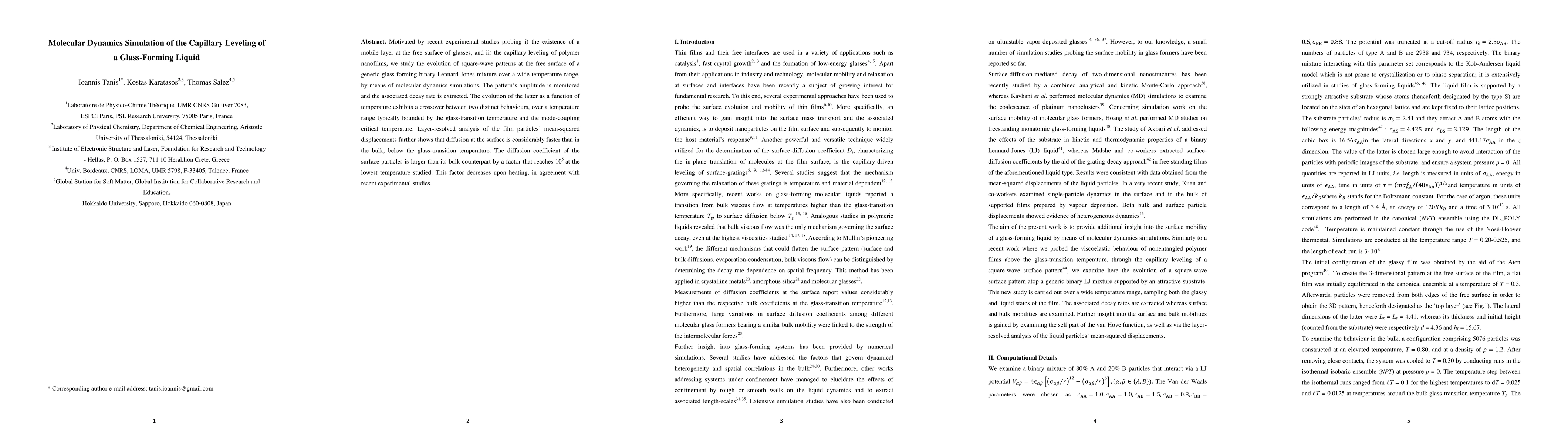 Motivated by recent experimental studies probing i) the existence of a mobile layer at the free surface of glasses, and ii) the capillary leveling of polymer nanofilms, we study the evolution of square-wave patterns at the free surface of a generic glass-forming binary Lennard-Jones mixture over a wide temperature range, by means of molecular dynamics simulations. The pattern's amplitude is monitored and the associated decay rate is extracted. The evolution of the latter as a function of temperature exhibits a crossover between two distinct behaviours, over a temperature range typically bounded by the glass-transition temperature and the mode-coupling critical temperature. Layer-resolved analysis of the film particles' mean-squared displacements further shows that diffusion at the surface is considerably faster than in the bulk, below the glass-transition temperature. The diffusion coefficient of the surface particles is larger than its bulk counterpart by a factor that reaches 105 at the lowest temperature studied. This factor decreases upon heating, in agreement with recent experimental studies.