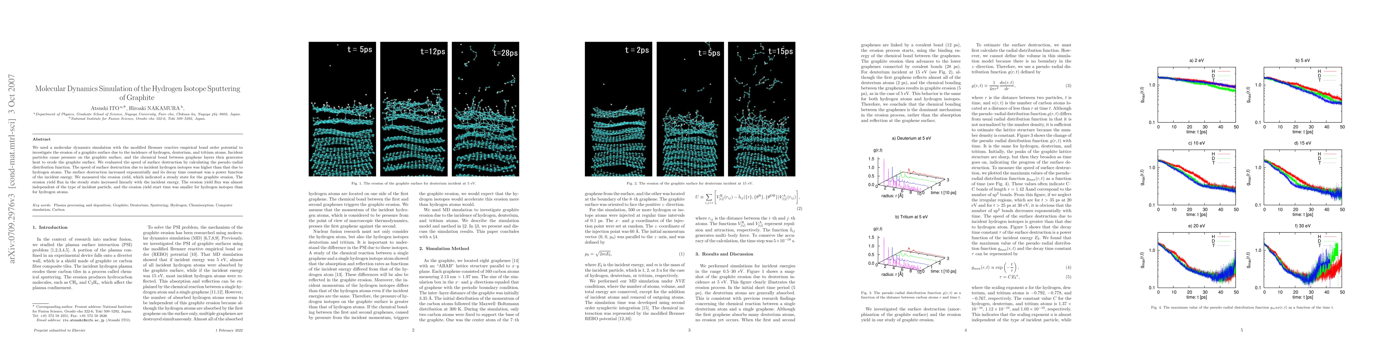 This study uses molecular dynamics simulations to explore graphite erosion from hydrogen isotopes (H, D, T) sputtering. The simulations show higher erosion rates for isotopes compared to hydrogen, with exponential surface destruction and a linear increase in erosion yield flux with incident energy.