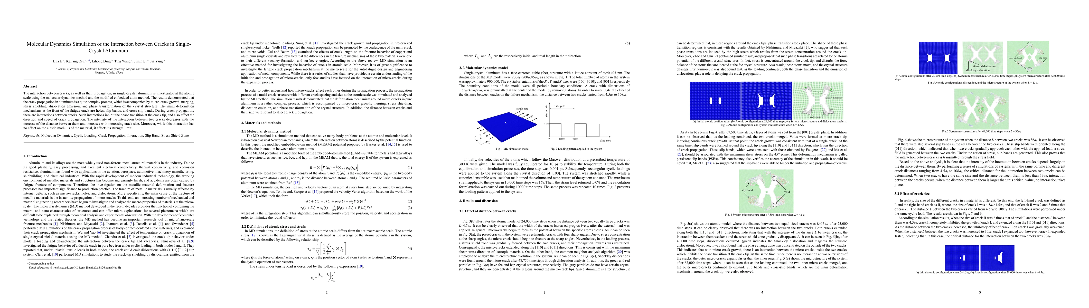 The interaction between cracks, as well as their propagation, in single-crystal aluminum is investigated at the atomic scale using the molecular dynamics method and the modified embedded atom method. The results demonstrated that the crack propagation in aluminum is a quite complex process, which is accompanied by micro-crack growth, merging, stress shielding, dislocation emission, and phase transformation of the crystal structure. The main deformation mechanisms at the front of the fatigue crack are holes, slip bands, and cross-slip bands. During crack propagation, there are interactions between cracks. Such interactions inhibit the phase transition at the crack tip, and also affect the direction and speed of crack propagation. The intensity of the interaction between two cracks decreases with the increase of the distance between them and increases with increasing crack size. Moreover, while this interaction has no effect on the elastic modulus of the material, it affects its strength limit.