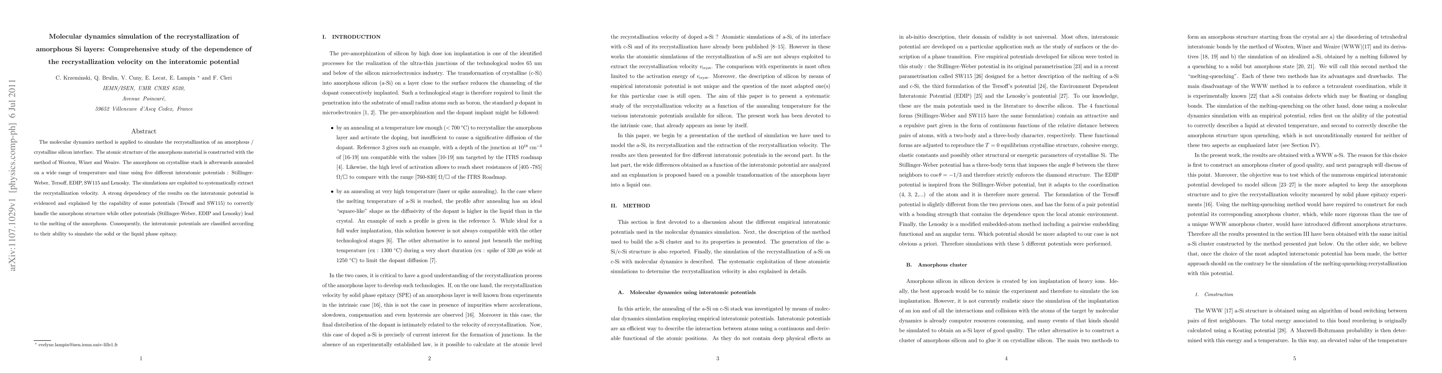 The molecular dynamics method is applied to simulate the recrystallization of an amorphous/crystalline silicon interface. The atomic structure of the amorphous material is constructed with the method of Wooten, Winer, and Weaire. The amorphous on crystalline stack is annealed afterward on a wide range of temperature and time using five different interatomic potentials: Stillinger-Weber, Tersoff, EDIP, SW115, and Lenosky. The simulations are exploited to systematically extract the recrystallization velocity. A strong dependency of the results on the interatomic potential is evidenced and explained by the capability of some potentials (Tersoff and SW115) to correctly handle the amorphous structure, while other potentials (Stillinger-Weber, EDIP, and Lenosky) lead to the melting of the amorphous. Consequently, the interatomic potentials are classified according to their ability to simulate the solid or the liquid phase epitaxy.