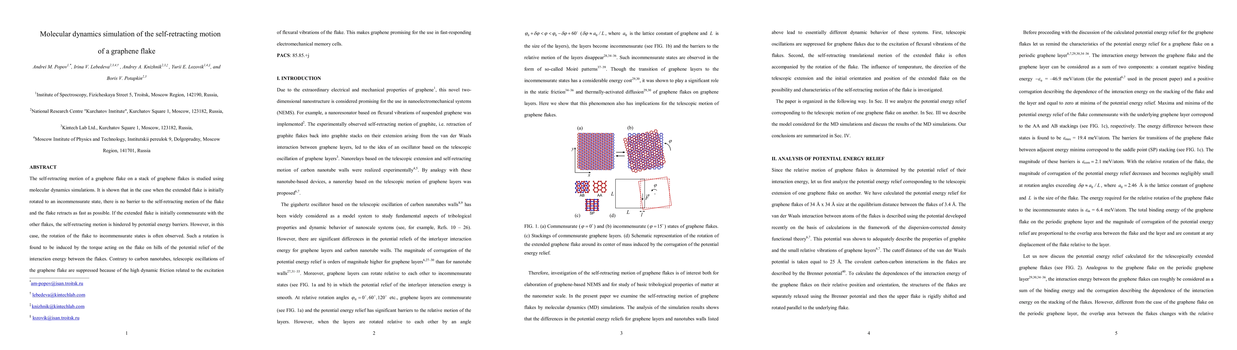 This paper uses molecular dynamics simulations to study the self-retracting motion of a graphene flake on a stack of graphene flakes. The study finds that the flake retracts quickly without barriers when initially rotated incommensurately, while potential energy barriers hinder retraction when initially commensurate, often inducing rotation to incommensurate states.