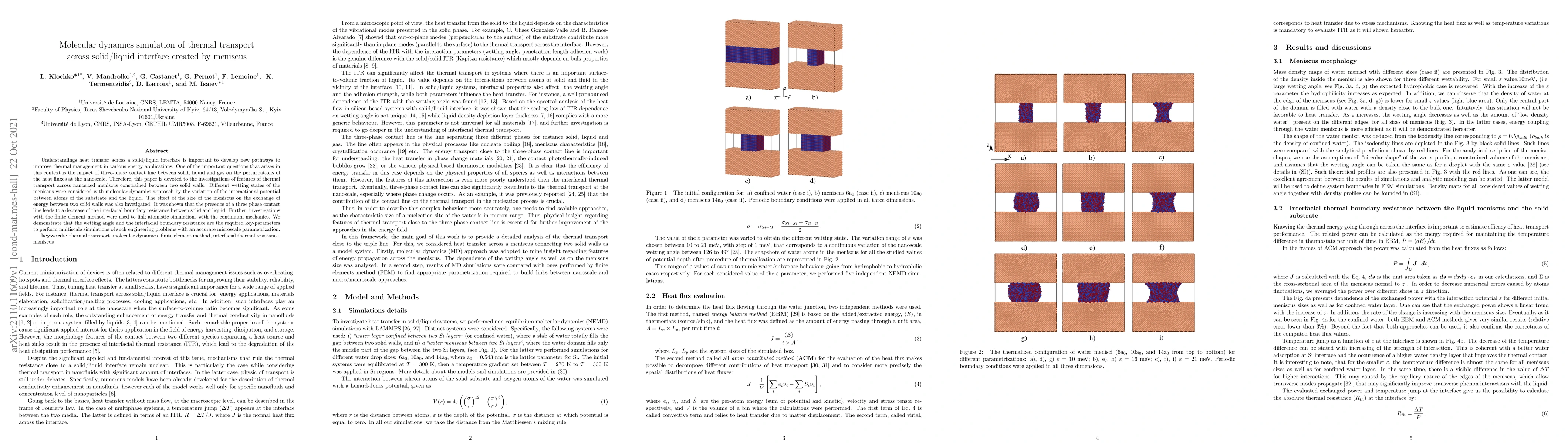 Understandings heat transfer across a solid/liquid interface is important to develop new pathways to improve thermal management in various energy applications. One of the important questions that arises in this context is the impact of three-phase contact line between solid, liquid and gas on the perturbations of the heat fluxes at the nanoscale. Therefore, this paper is devoted to the investigations of features of thermal transport across nanosized meniscus constrained between two solid walls. Different wetting states of the meniscus were considered with molecular dynamics approach by the variation of the interactional potential between atoms of the substrate and the liquid. The effect of the size of the meniscus on the exchange of energy between two solid walls was also investigated. It was shown that the presence of a three phase contact line leads to a decrease of the interfacial boundary resistance between solid and liquid. Further, investigations with the finite element method were used to link atomistic simulations with the continuum mechanics. We demonstrate that the wetting angle and the interfacial boundary resistance are the required key-parameters to perform multiscale simulations of such engineering problems with an accurate microscale parametrization.