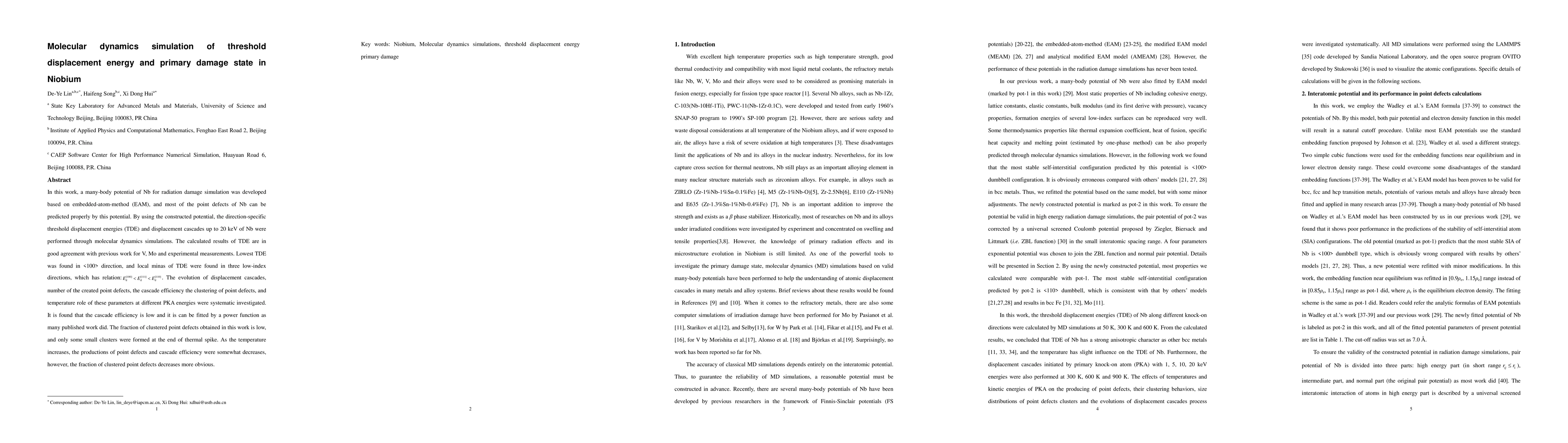 Researchers simulated radiation damage in niobium using a new molecular dynamics model, finding that threshold displacement energies vary depending on direction and temperature, with the lowest energy found in the <100> direction.
