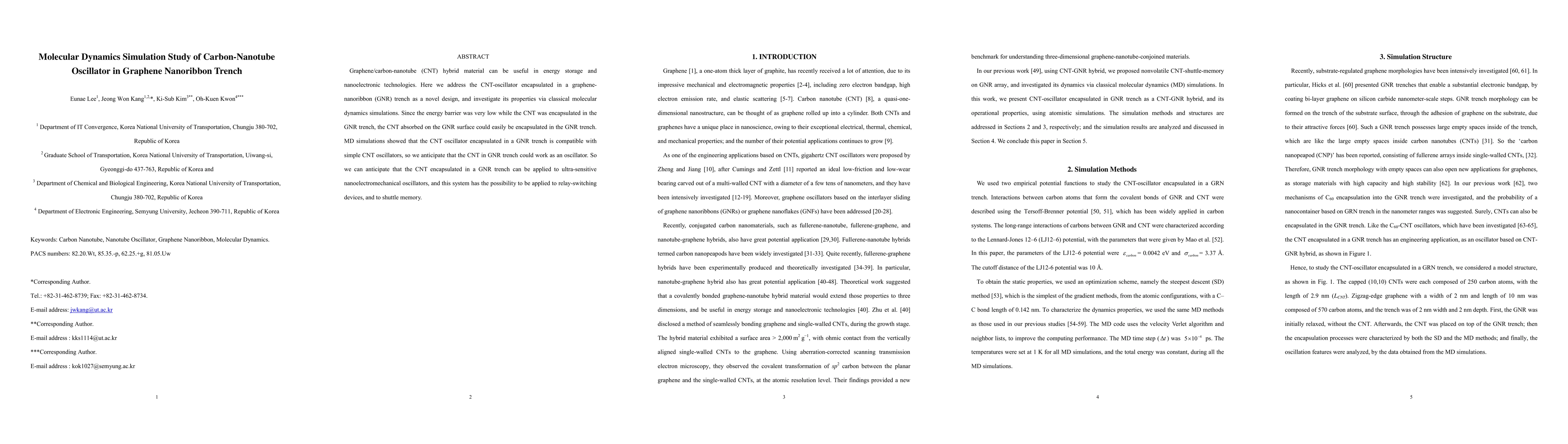 This study investigates the properties of a carbon-nanotube oscillator encapsulated in a graphene-nanoribbon trench using molecular dynamics simulations. The low energy barrier suggests the potential for ultra-sensitive nanoelectromechanical oscillators, relay-switching devices, and shuttle memory applications.