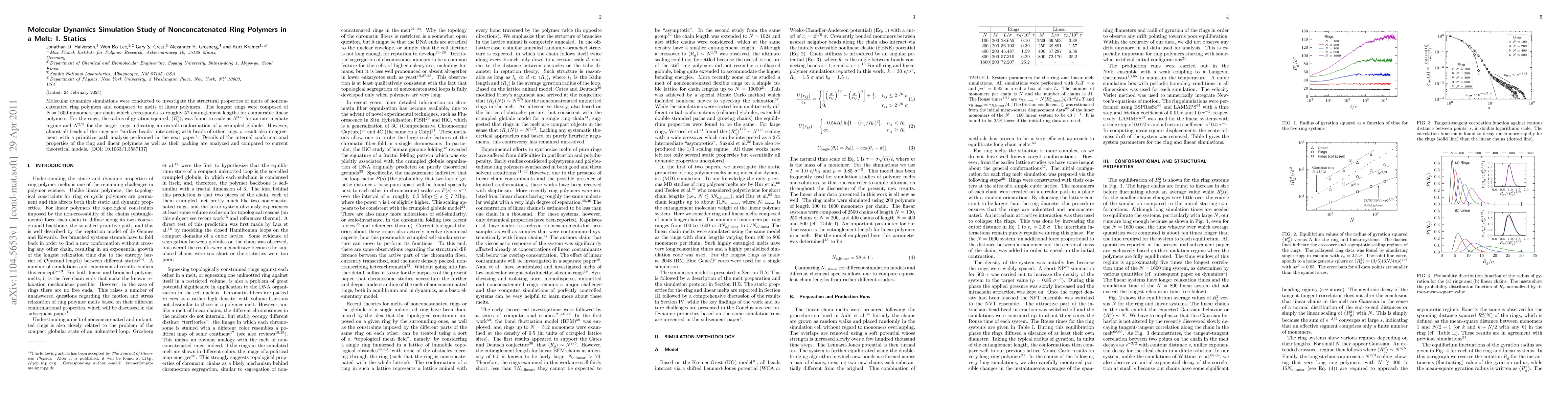 This study uses molecular dynamics simulations to explore the static structural properties of melts composed of nonconcatenated ring polymers, finding that their radius of gyration scales differently than linear polymers, indicating a "crumpled globule" conformation. The rings predominantly consist of surface beads interacting with other rings, aligning with theoretical models.