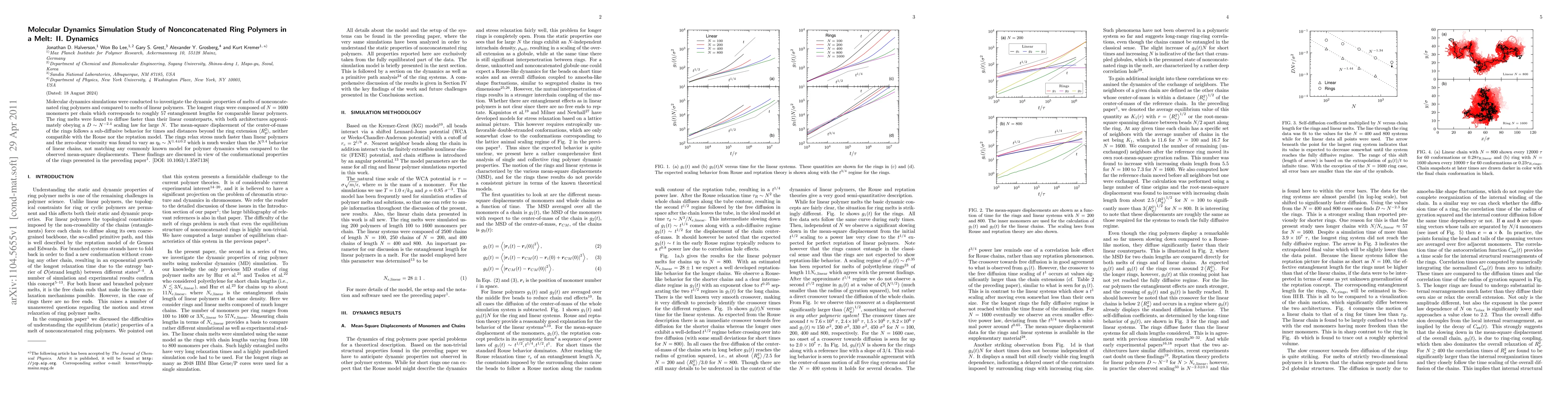 This study uses molecular dynamics simulations to explore the dynamic properties of melts of nonconcatenated ring polymers, revealing faster diffusion and sub-diffusive behavior compared to linear polymers. The zero-shear viscosity of ring polymers scales differently, challenging existing models for polymer dynamics.