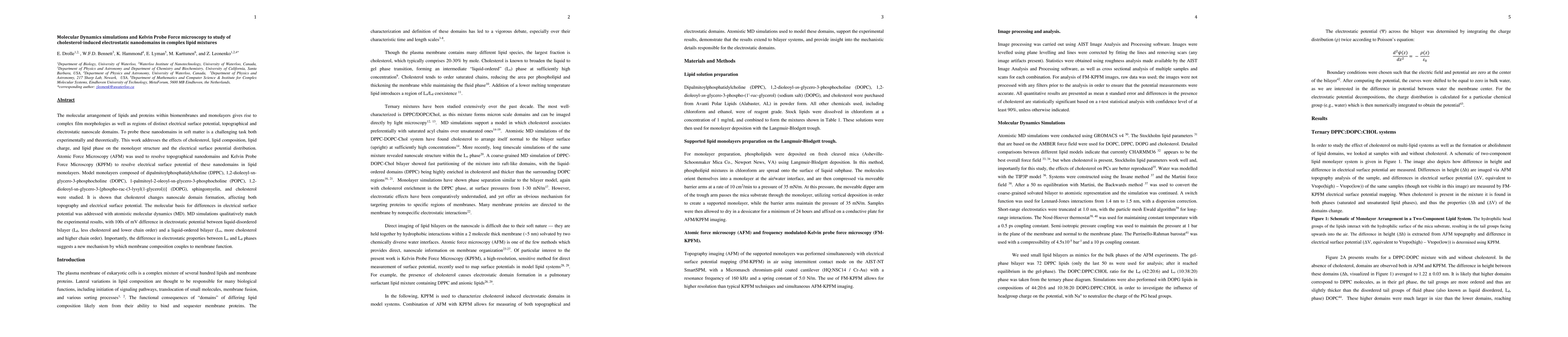 This study uses Molecular Dynamics simulations and Kelvin Probe Force Microscopy to investigate how cholesterol influences electrostatic nanodomains in complex lipid mixtures. Results show that cholesterol alters both the topography and electrical surface potential of lipid monolayers, with significant differences between liquid-disordered and liquid-ordered phases, suggesting a new mechanism linking membrane composition to function.
