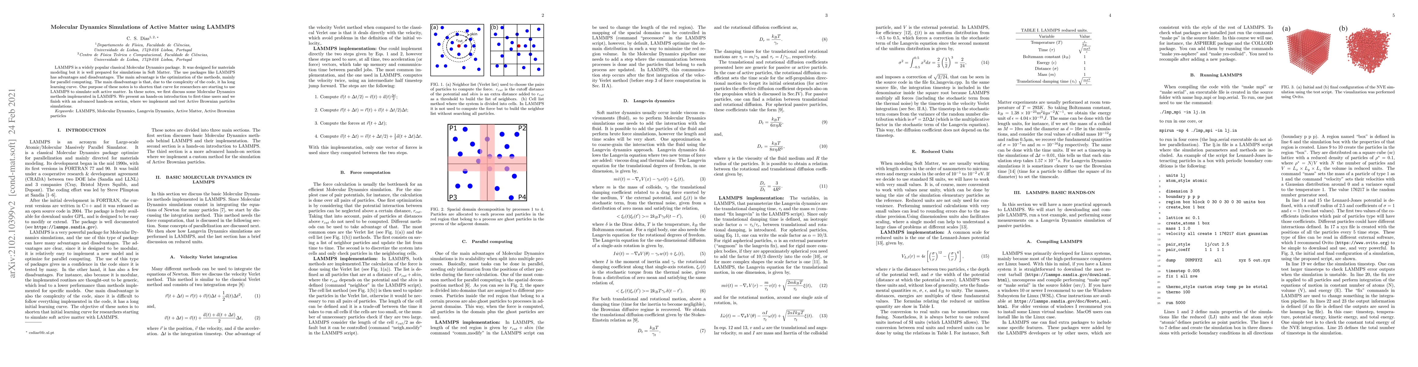 LAMMPS is a widely popular classical Molecular Dynamics package. It was designed for materials modeling but it is well prepared for simulations in Soft Matter. The use packages like LAMMPS has advantages and disadvantages. The main advantage is the optimization of the methods, mainly for parallel computing. The main disadvantage is that, due to the complexity of the code, it ha long learning curve. One purpose of these notes is to shorten that curve for researchers are starting to use LAMMPS to simulate soft active matter. In these notes, we first discuss some Molecular Dynamics methods implemented in LAMMPS. We present an hands-on introduction to first-time users and we finish with an advanced hands-on section, where we implement and test Active Brownian particles simulations.
