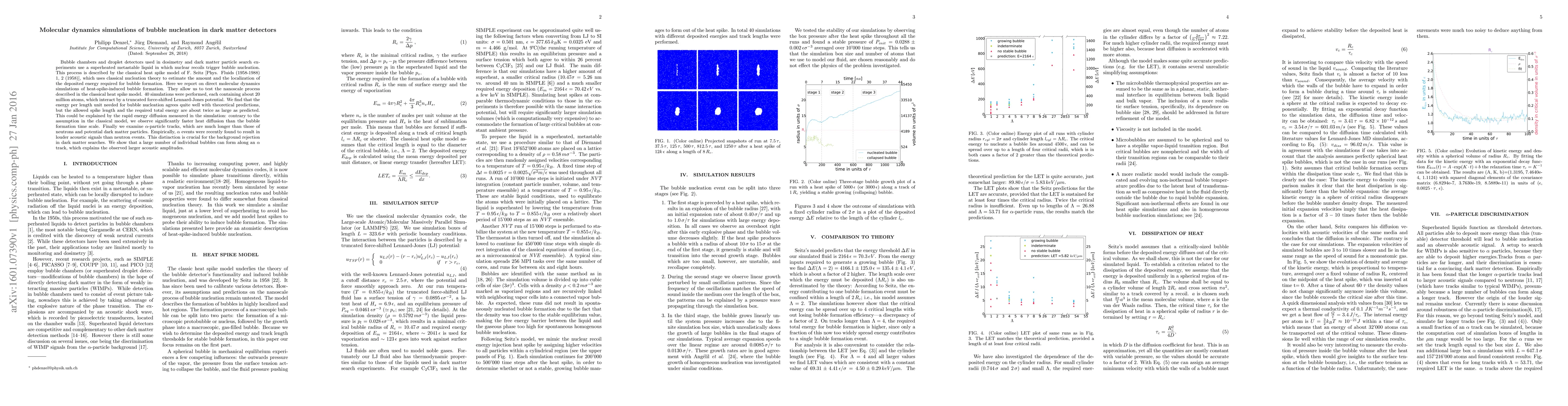 The research employs molecular dynamics simulations using the Large-scale Atomic/Molecular Massively Parallel Simulator (LAMMPS) to study bubble nucleation in dark matter detectors. Simulations involve a truncated force-shifted Lennard-Jones potential with 20 million atoms, modeling a superheated metastable liquid where nuclear recoils trigger bubble formation.