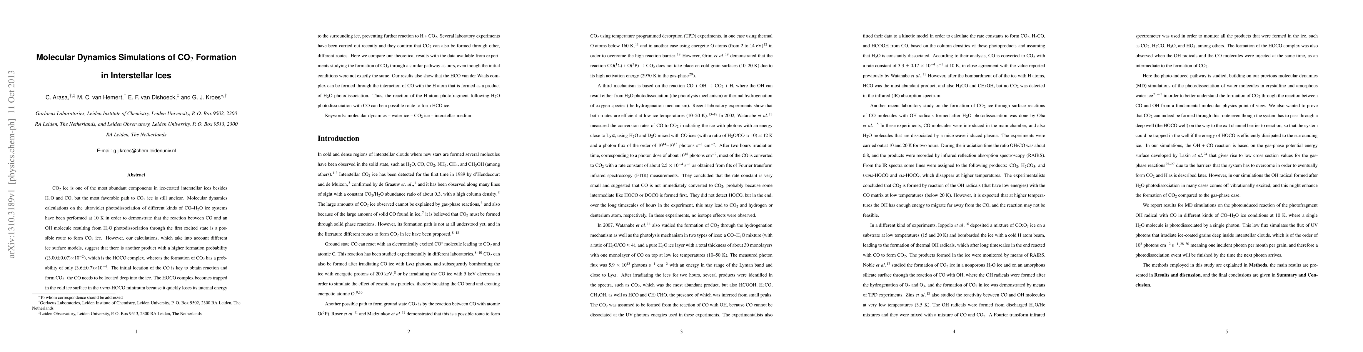 This research uses molecular dynamics simulations to explore the formation pathways of CO2 in interstellar ices, finding that while CO2 can form via CO reacting with OH from H2O photodissociation, the HOCO complex is more likely to form. The study highlights the importance of CO's initial location within the ice for CO2 formation and compares theoretical results with experimental data, also noting the potential formation of HCO via H atom interaction with CO.