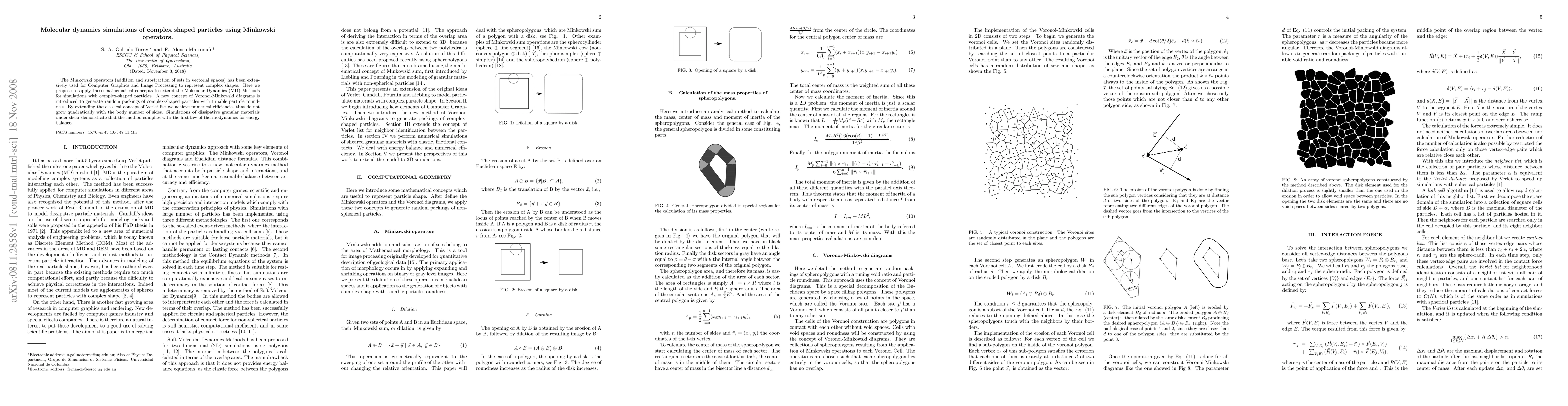 The Minkowski operators (addition and substraction of sets in vectorial spaces) has been extensively used for Computer Graphics and Image Processing to represent complex shapes. Here we propose to apply those mathematical concepts to extend the Molecular Dynamics (MD) Methods for simulations with complex-shaped particles. A new concept of Voronoi-Minkowski diagrams is introduced to generate random packings of complex-shaped particles with tunable particle roundness. By extending the classical concept of Verlet list we achieve numerical efficiencies that do not grow quadratically with the body number of sides. Simulations of dissipative granular materials under shear demonstrate that the method complies with the first law of thermodynamics for energy balance.
