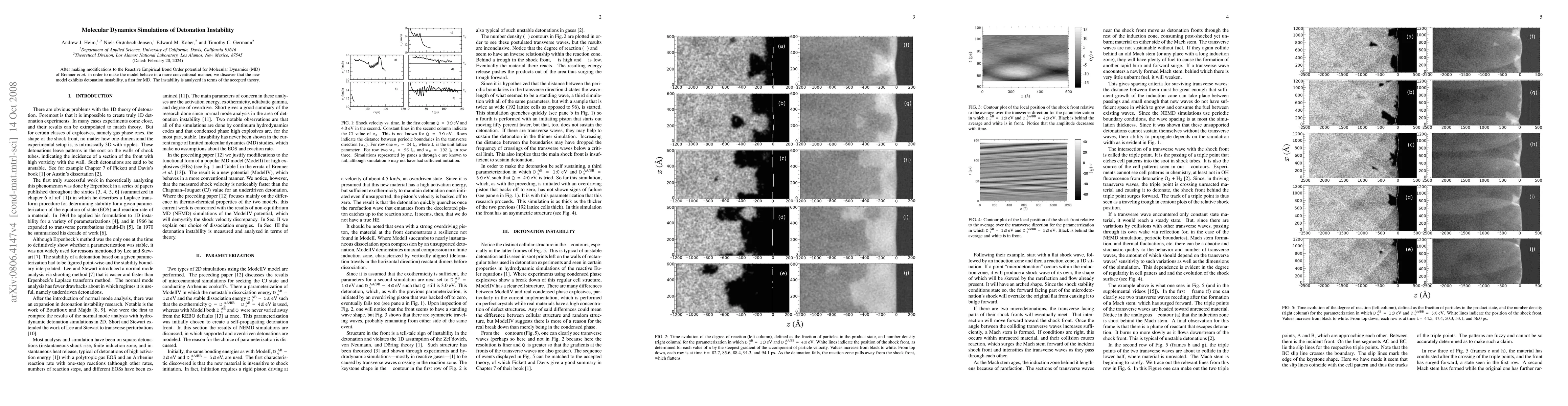 This paper explores modified Reactive Empirical Bond Order potentials for Molecular Dynamics simulations, revealing detonation instability for the first time in MD simulations. The observed instability is analyzed using established theoretical frameworks.
