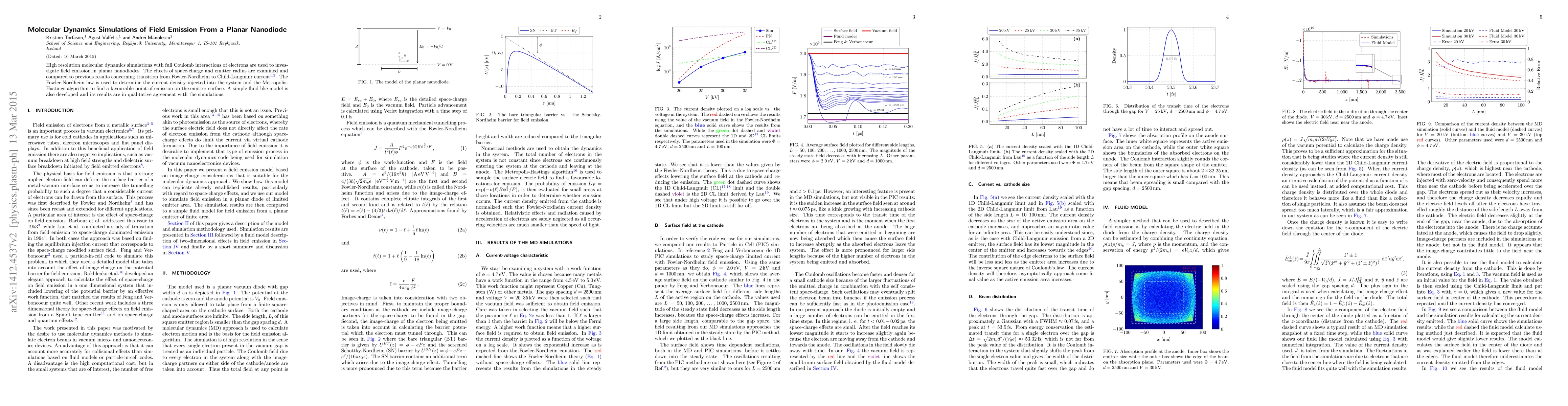 This paper uses high-resolution molecular dynamics simulations to study field emission in planar nanodiodes, examining the effects of space charge and emitter radius. The results show qualitative agreement between a developed fluid-like model and the simulations, highlighting the transition from Fowler-Nordheim to Child-Langmuir current.