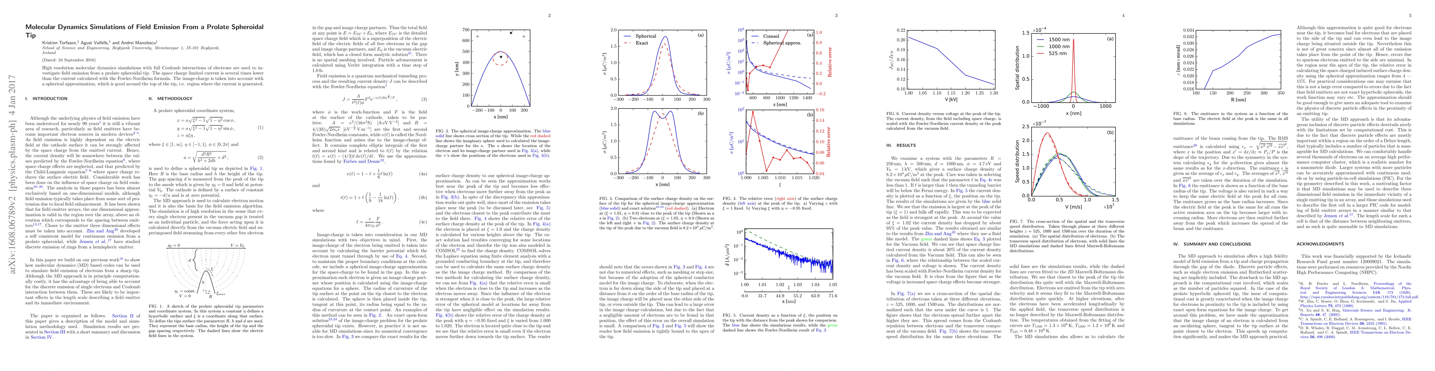 This paper uses high-resolution molecular dynamics simulations to study field emission from a prolate spheroidal tip, finding that the space charge limited current is significantly lower than predicted by the Fowler-Nordheim formula, with the image-charge effect approximated using a spherical model.