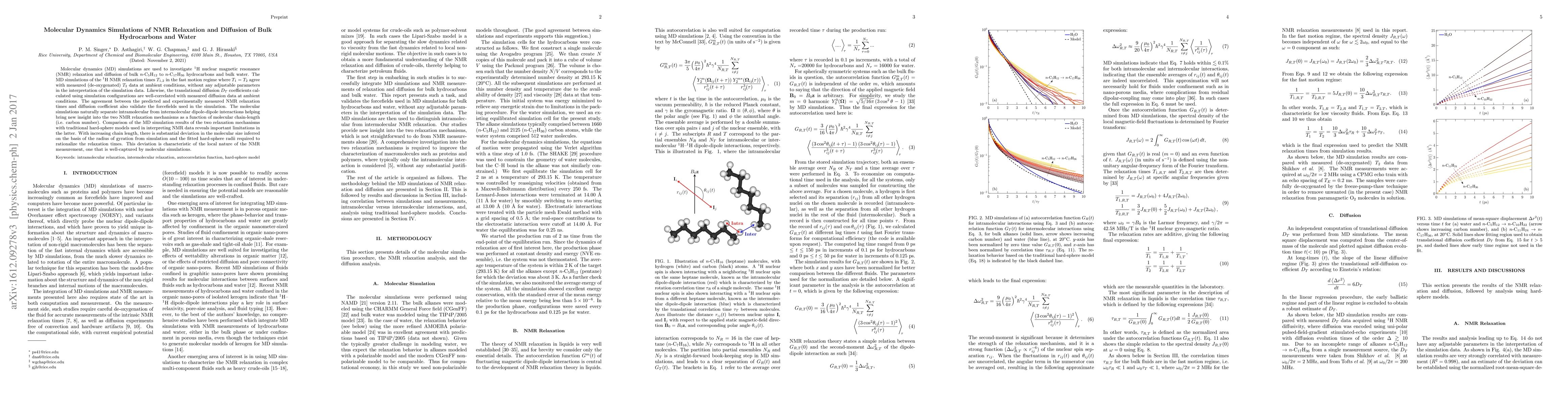 This paper uses molecular dynamics simulations to study $^1$H NMR relaxation and diffusion in hydrocarbons and water, showing good agreement between simulation and experimental data. The simulations provide insights into the relaxation mechanisms and highlight limitations of traditional hard-sphere models.