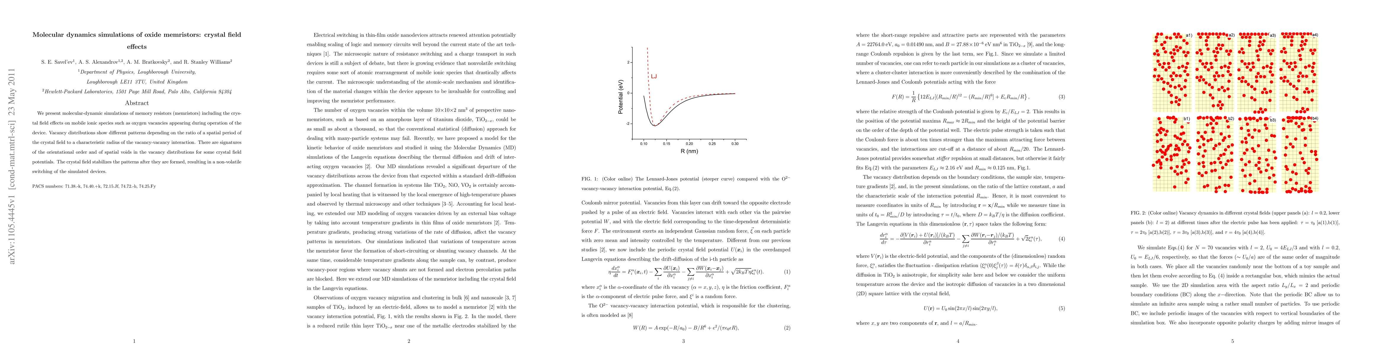 We present molecular-dynamic simulations of memory resistors (memristors) including the crystal field effects on mobile ionic species such as oxygen vacancies appearing during operation of the device. Vacancy distributions show different patterns depending on the ratio of a spatial period of the crystal field to a characteristic radius of the vacancy-vacancy interaction. There are signatures of the orientational order and of spatial voids in the vacancy distributions for some crystal field potentials. The crystal field stabilizes the patterns after they are formed, resulting in a non-volatile switching of the simulated devices.