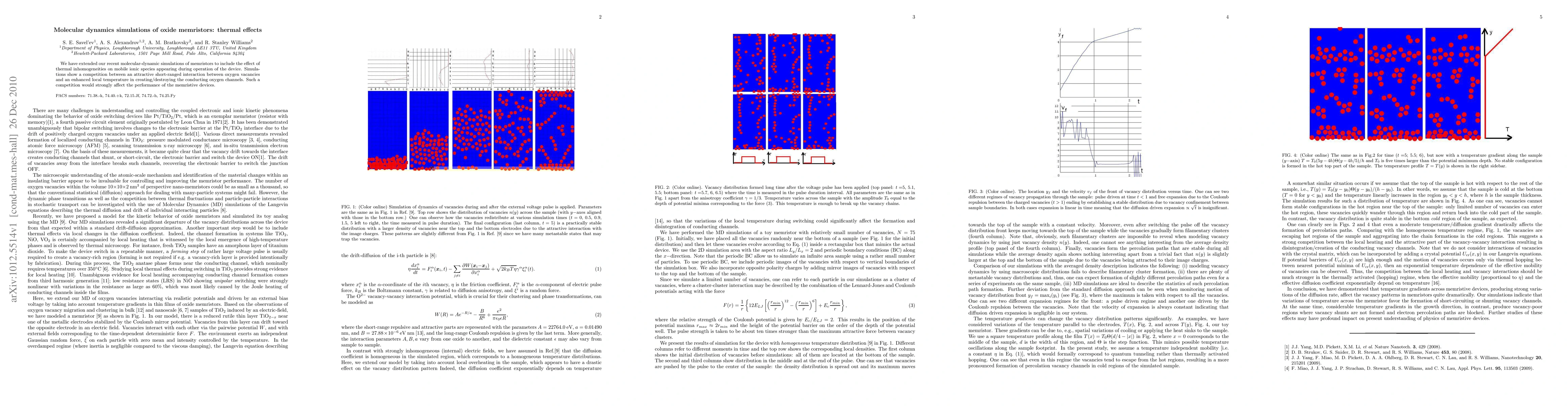 We have extended our recent molecular-dynamic simulations of memristors to include the effect of thermal inhomogeneities on mobile ionic species appearing during operation of the device. Simulations show a competition between an attractive short-ranged interaction between oxygen vacancies and an enhanced local temperature in creating/destroying the conducting oxygen channels. Such a competition would strongly affect the performance of the memristive devices.