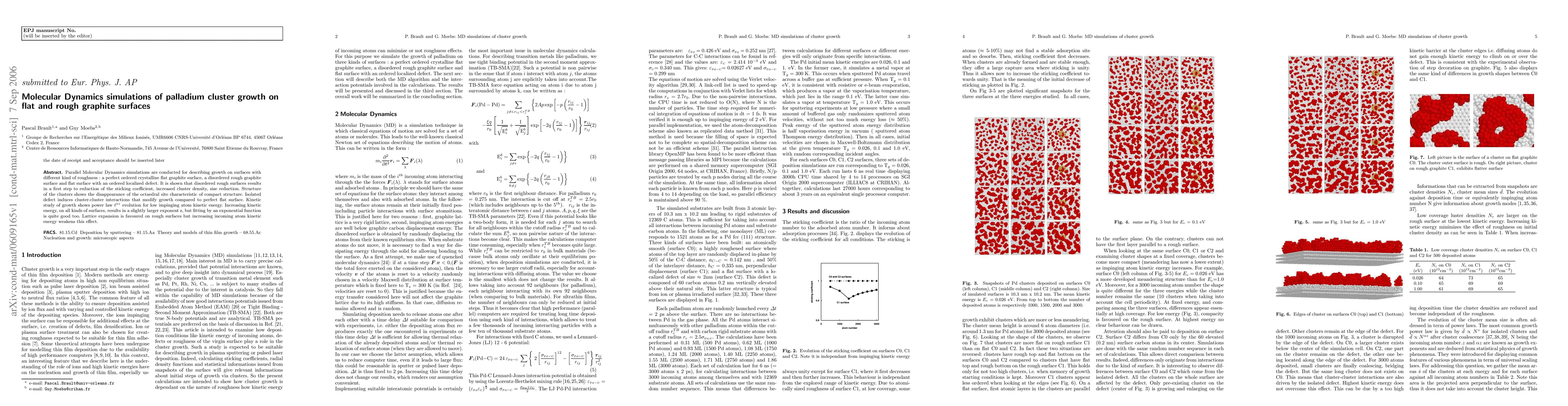 Parallel Molecular Dynamics simulations are conducted for describing growth on surfaces with different kind of roughness: a perfect ordered crystalline flat graphite surface, a disordered rough graphite surface and flat surface with an ordered localized defect. It is shown that disordered rough surfaces results in a first step to reduction of the sticking coefficient, increased cluster density, size reduction. Structure of the clusters shows the disappearance of the octahedral site characteristic of compact structure. Isolated defect induces cluster-cluster interactions that modify growth compared to perfect flat surface. Kinetic study of growth shows power law tαz evolution for low impinging atom kinetic energy. Increasing kinetic energy, on all kinds of surfaces, results in a slightly larger exponent z, but fitting by an exponential function is quite good too. Lattice expansion is favoured on rough surfaces but increasing incoming atom kinetic energy weakens this effect.