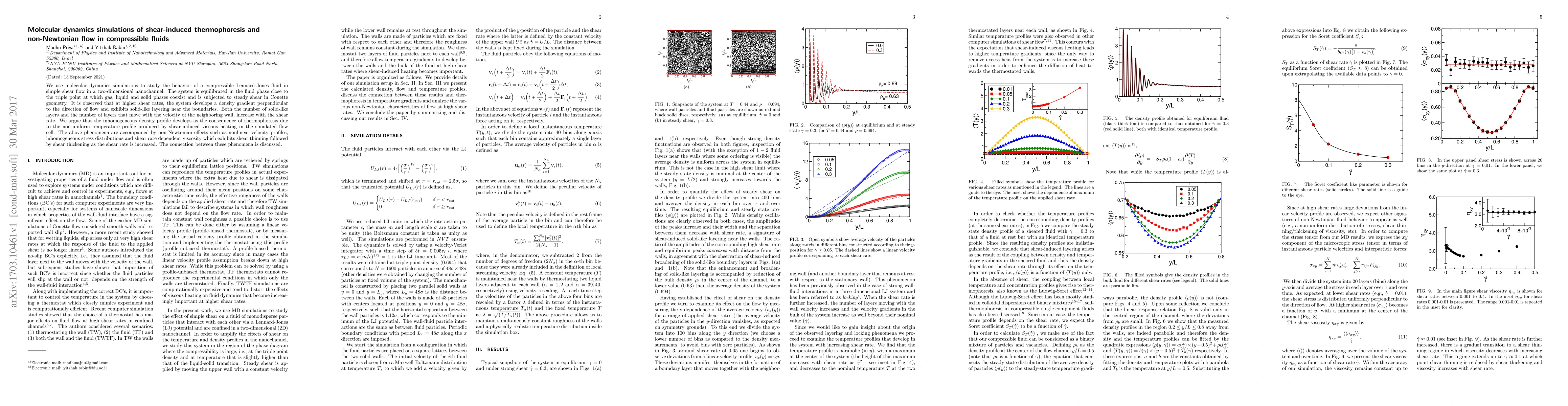 This paper uses molecular dynamics simulations to explore shear-induced thermophoresis and non-Newtonian flow in a compressible Lennard-Jones fluid, revealing solid-like layering and density gradients due to shear-induced viscous heating, alongside non-Newtonian effects like shear thinning and thickening.