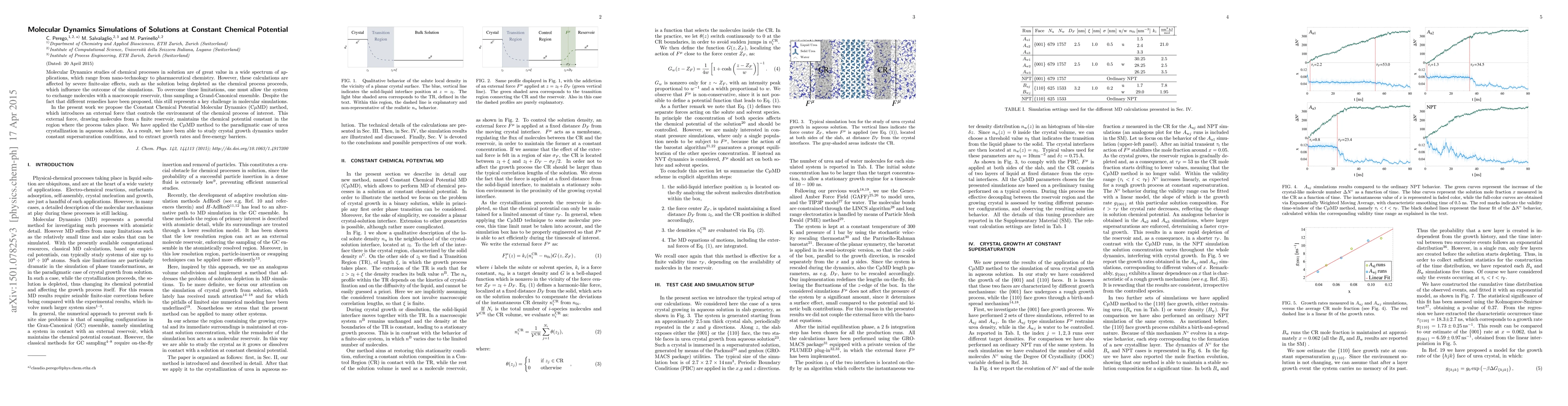 The paper introduces the Constant Chemical Potential Molecular Dynamics (C$\mu$MD) method to mitigate finite-size effects in molecular simulations by maintaining a constant chemical potential during chemical processes. The method was applied to study urea crystallization in aqueous solution, yielding insights into crystal growth dynamics, growth rates, and free-energy barriers.