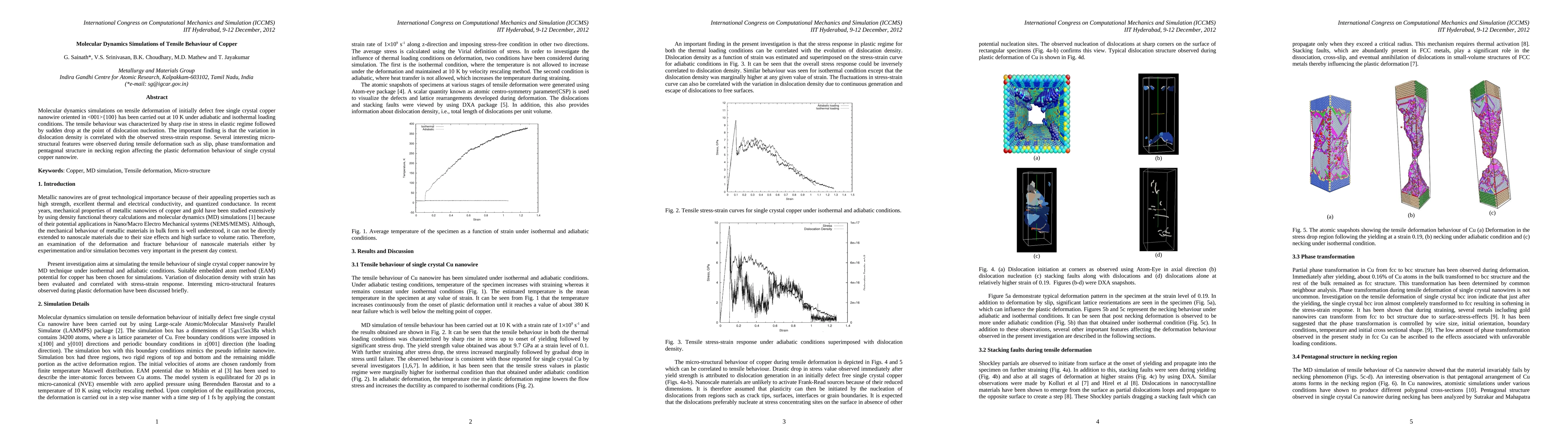Molecular dynamics simulations were used to study the tensile behavior of copper nanowires under adiabatic and isothermal conditions.