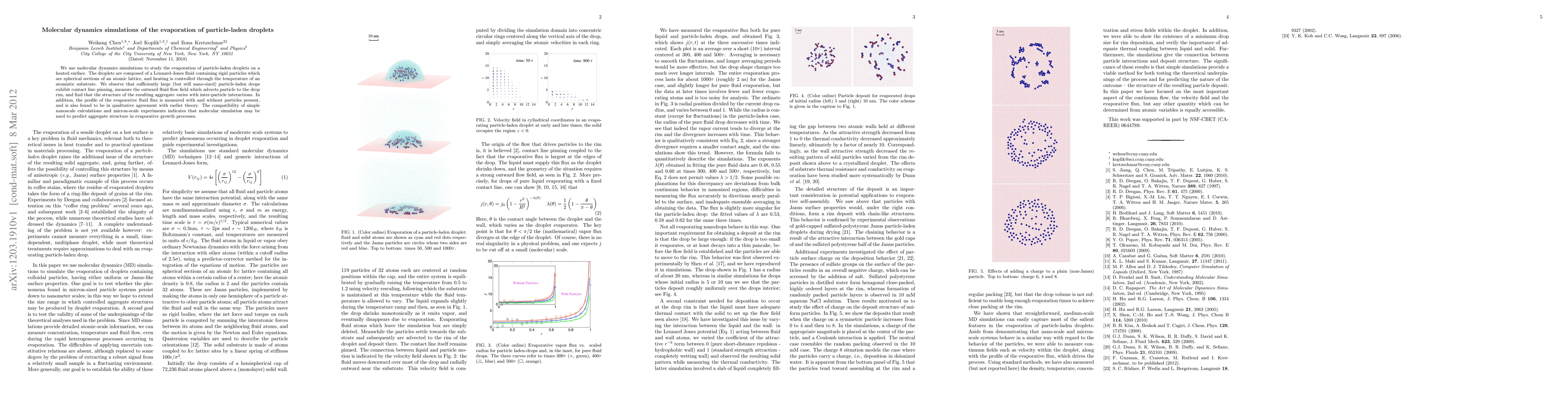 We use molecular dynamics simulations to study the evaporation of particle-laden droplets on a heated surface. The droplets are composed of a Lennard-Jones fluid containing rigid particles which are spherical sections of an atomic lattice, and heating is controlled through the temperature of an atomistic substrate. We observe that sufficiently large (but still nano-sized) particle-laden drops exhibit contact line pinning, measure the outward fluid flow field which advects particle to the drop rim, and find that the structure of the resulting aggregate varies with inter-particle interactions. In addition, the profile of the evaporative fluid flux is measured with and without particles present, and is also found to be in qualitative agreement with earlier theory. The compatibility of simple nanoscale calculations and micron-scale experiments indicates that molecular simulation may be used to predict aggregate structure in evaporative growth processes.