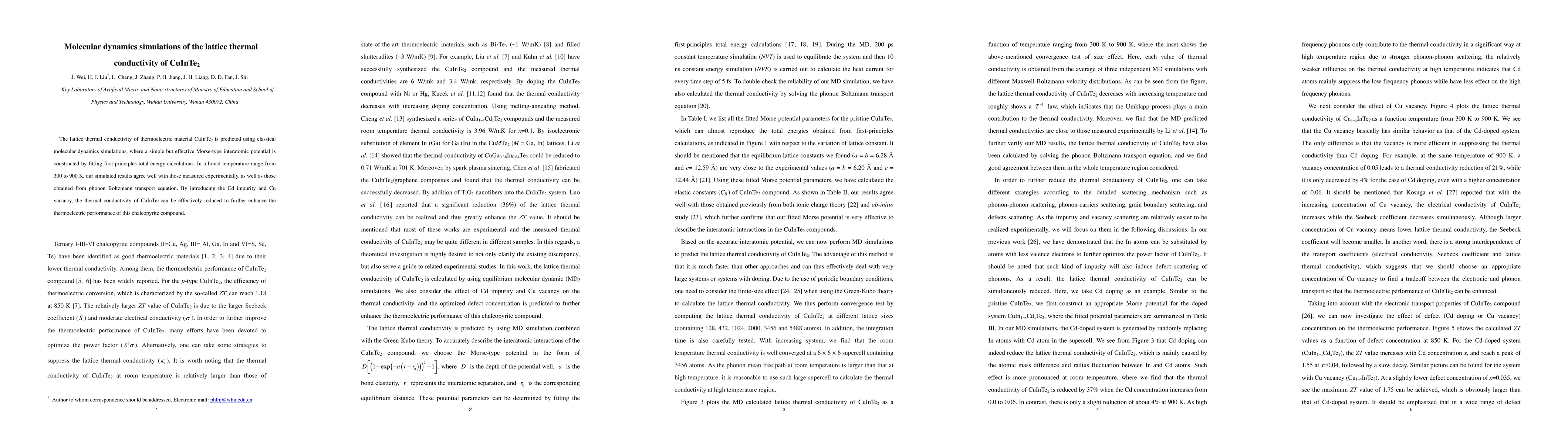 This study uses molecular dynamics simulations to predict the lattice thermal conductivity of CuInTe2, employing a Morse-type interatomic potential derived from first-principles calculations. The simulations accurately match experimental and theoretical data across a wide temperature range, and suggest that introducing Cd impurities or Cu vacancies can reduce thermal conductivity to improve thermoelectric performance.