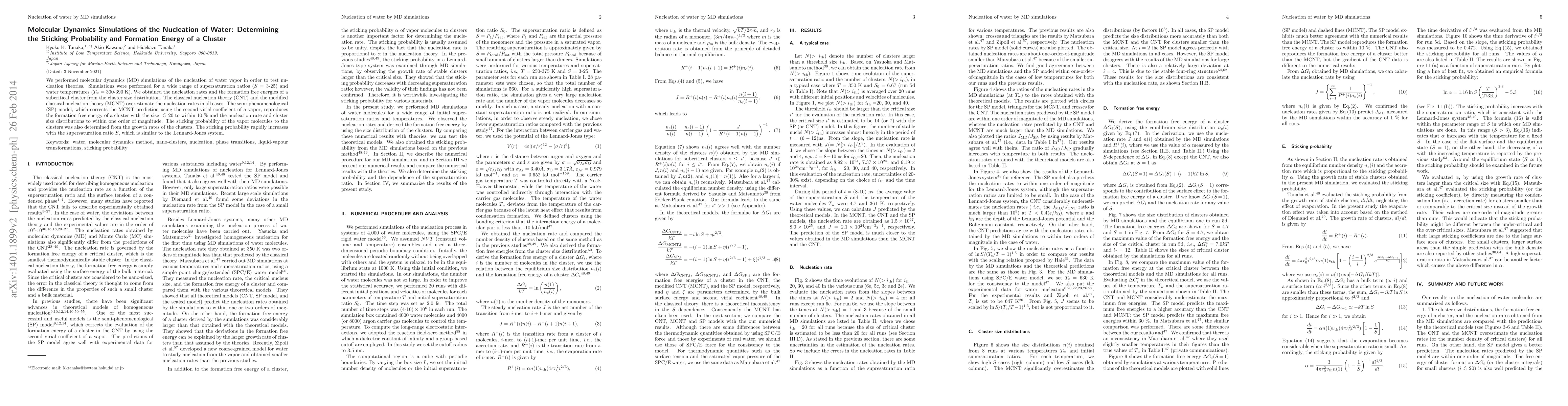 We performed molecular dynamics (MD) simulations of the nucleation of water vapor in order to test nucleation theories. Simulations were performed for a wide range of supersaturation ratios (S = 3-25) and water temperatures (Tw=300-390K). We obtained the nucleation rates and the formation free energies of a subcritical cluster from the cluster size distribution. The classical nucleation theory (CNT) and the modified classical nucleation theory (MCNT) overestimate the nucleation rates in all cases. The semi-phenomenological (SP) model, which corrects the MCNT prediction using the second virial coefficient of a vapor, reproduces the formation free energy of a cluster with the size < 20 to within 10 % and the nucleation rate and cluster size distributions to within one order of magnitude. The sticking probability of the vapor molecules to the clusters was also determined from the growth rates of the clusters. The sticking probability rapidly increases with the supersaturation ratio S, which is similar to the Lennard-Jones system.