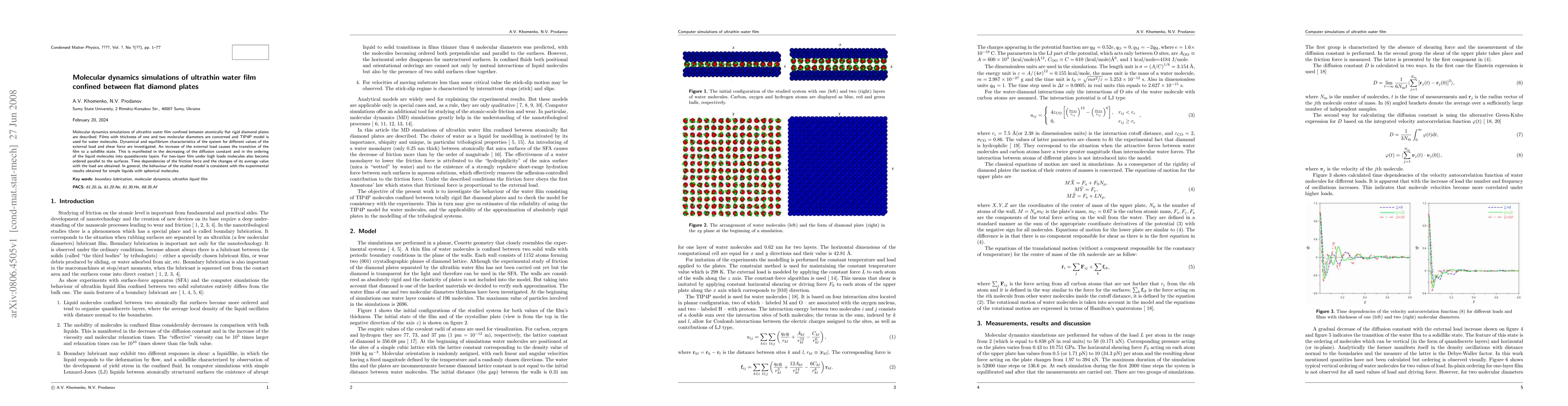 Molecular dynamics simulations of ultrathin water film confined between atomically flat rigid diamond plates are described. Films with thickness of one and two molecular diameters are concerned and TIP4P model is used for water molecules. Dynamical and equilibrium characteristics of the system for different values of the external load and shear force are investigated. An increase of the external load causes the transition of the film to a solidlike state. This is manifested in the decreasing of the diffusion constant and in the ordering of the liquid molecules into quasidiscrete layers. For two-layer film under high loads molecules also become ordered parallel to the surfaces. Time dependencies of the friction force and the changes of its average value with the load are obtained. In general, the behaviour of the studied model is consistent with the experimental results obtained for simple liquids with spherical molecules.