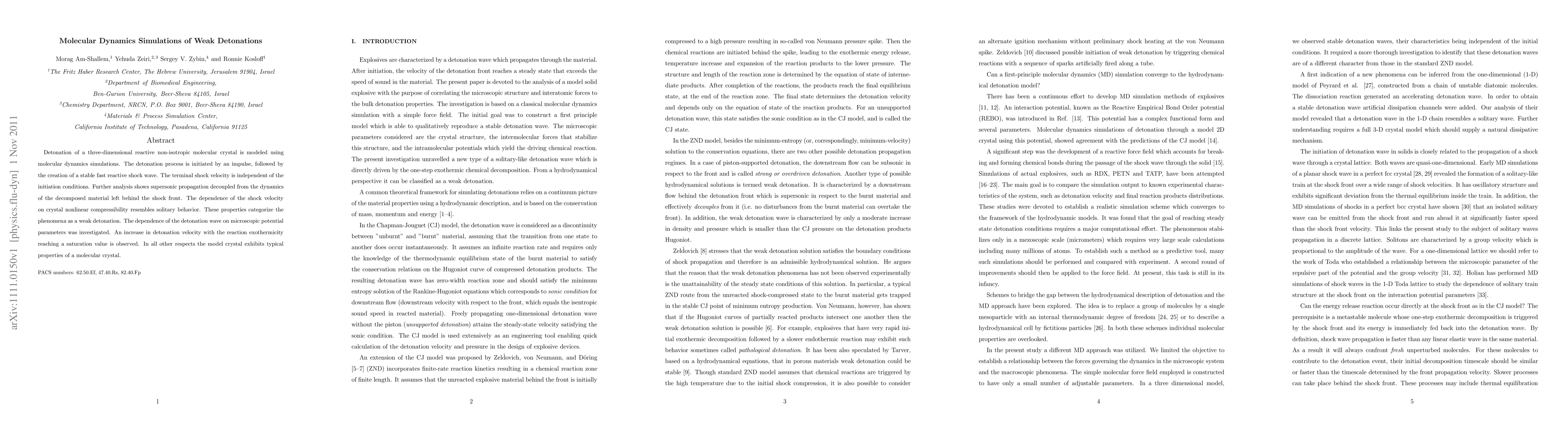 Molecular dynamics simulations reveal that detonation of a reactive molecular crystal can exhibit weak detonation behavior with independent terminal shock velocity and supersonic propagation decoupled from the decomposed material.