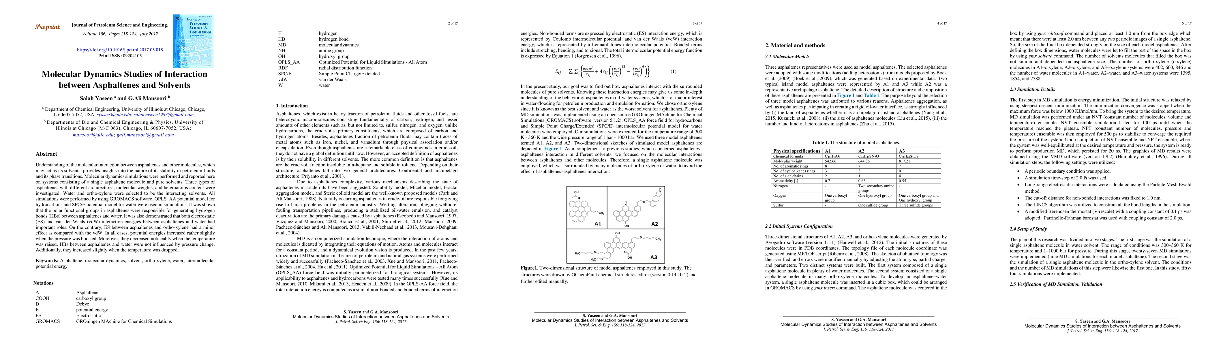 This study uses molecular dynamics simulations to analyze interactions between asphaltenes (with varying structures) and solvents like water and ortho-xylene. Key findings include hydrogen bonds between asphaltenes and water, driven by polar groups in asphaltenes, and significant electrostatic and van der Waals interactions. Pressure and temperature changes only slightly affect potential energies, while hydrogen bonds remain stable under pressure variations.