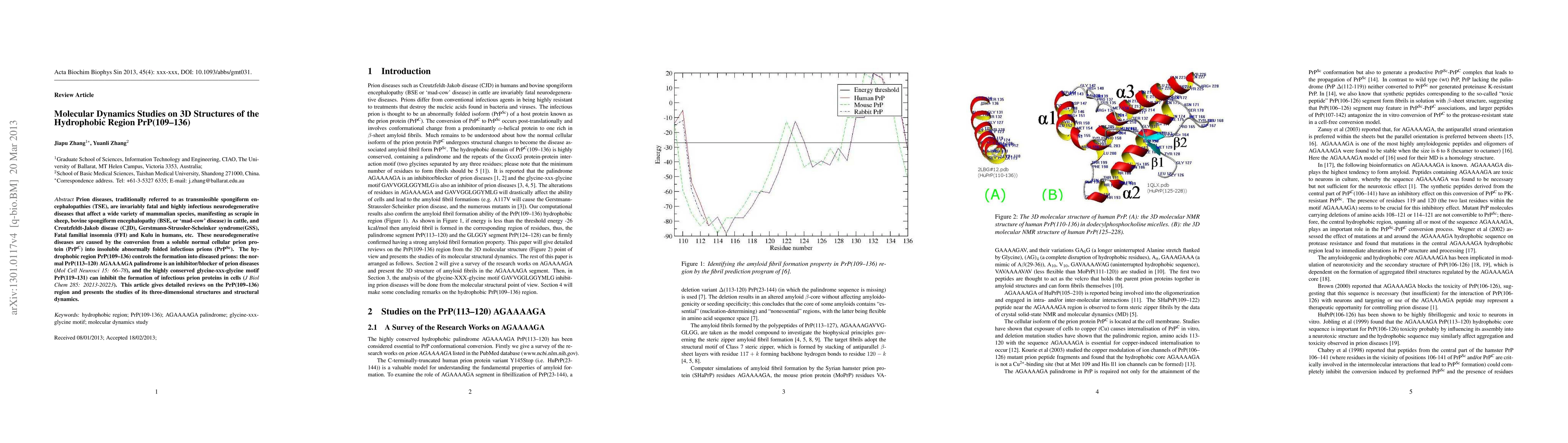 Prion diseases caused by the conversion from a soluble normal cellular prion protein into insoluble abnormally folded infectious prions, are invariably fatal and highly infectious degenerative diseases that affect a wide variety of mammalian species. The palindrome and the Glycine-rich conserved segment in the hydrophobic region 109-136 control the conversion from normal prion protein to form into diseased prions. This paper gives detailed reviews on the 109-136 region and presents the studies of its 3D structures and structural dynamics.