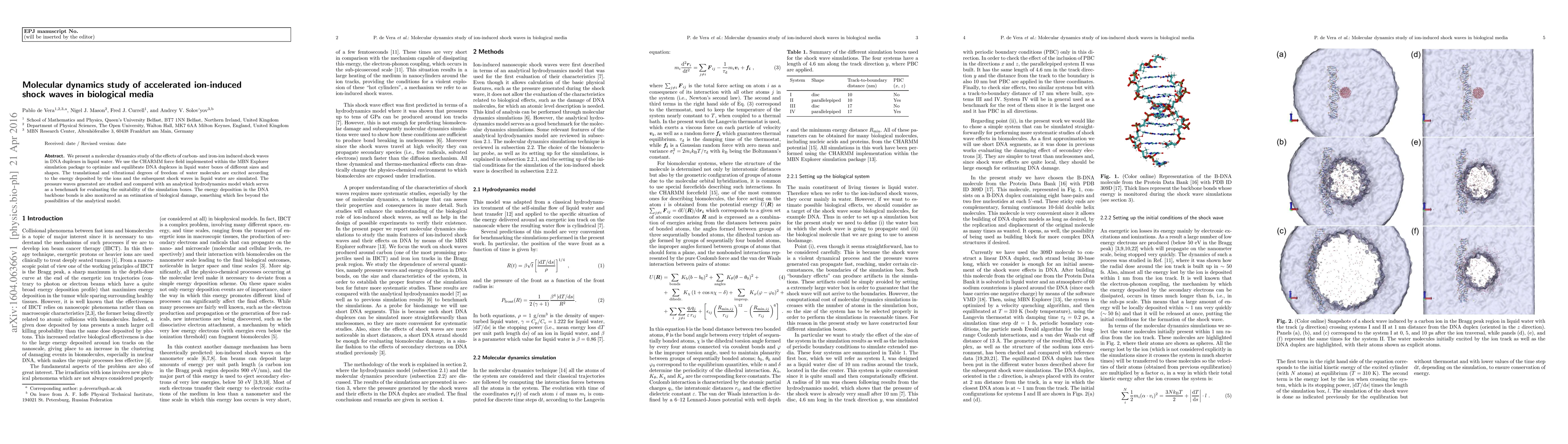 We present a molecular dynamics study of the effects of carbon- and iron-ion induced shock waves in DNA duplexes in liquid water. We use the CHARMM force field implemented within the MBN Explorer simulation package to optimize and equilibrate DNA duplexes in liquid water boxes of different sizes and shapes. The translational and vibrational degrees of freedom of water molecules are excited according to the energy deposited by the ions and the subsequent shock waves in liquid water are simulated. The pressure waves generated are studied and compared with an analytical hydrodynamics model which serves as a benchmark for evaluating the suitability of the simulation boxes. The energy deposition in the DNA backbone bonds is also monitored as an estimation of biological damage, something which lies beyond the possibilities of the analytical model.